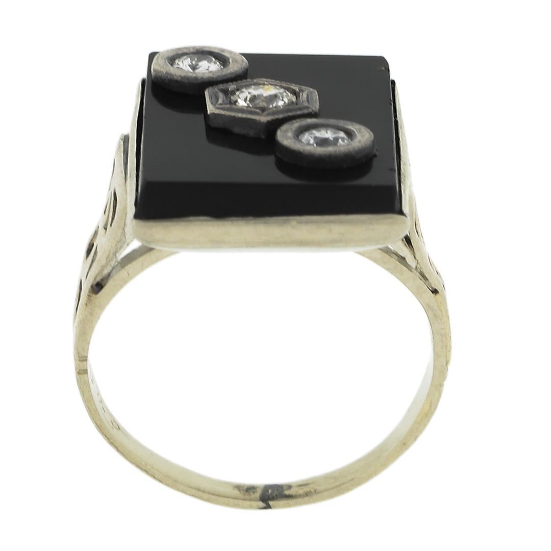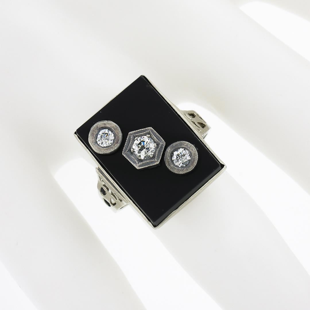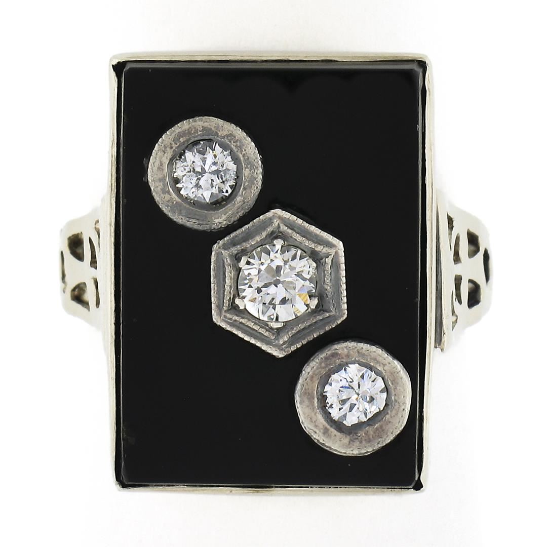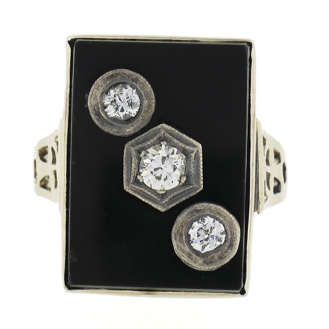 A vintage solid 10k white gold ring, with 1 rectangular cut natural black onyx (17.9x13mm), and 3 old European & old transitional cut natural diamonds (I/J - SI2-I1 ; 0.30ctw). The ring is size 6.0, weighs a total of 4.82 grams, and measures 18.9mm wide.
