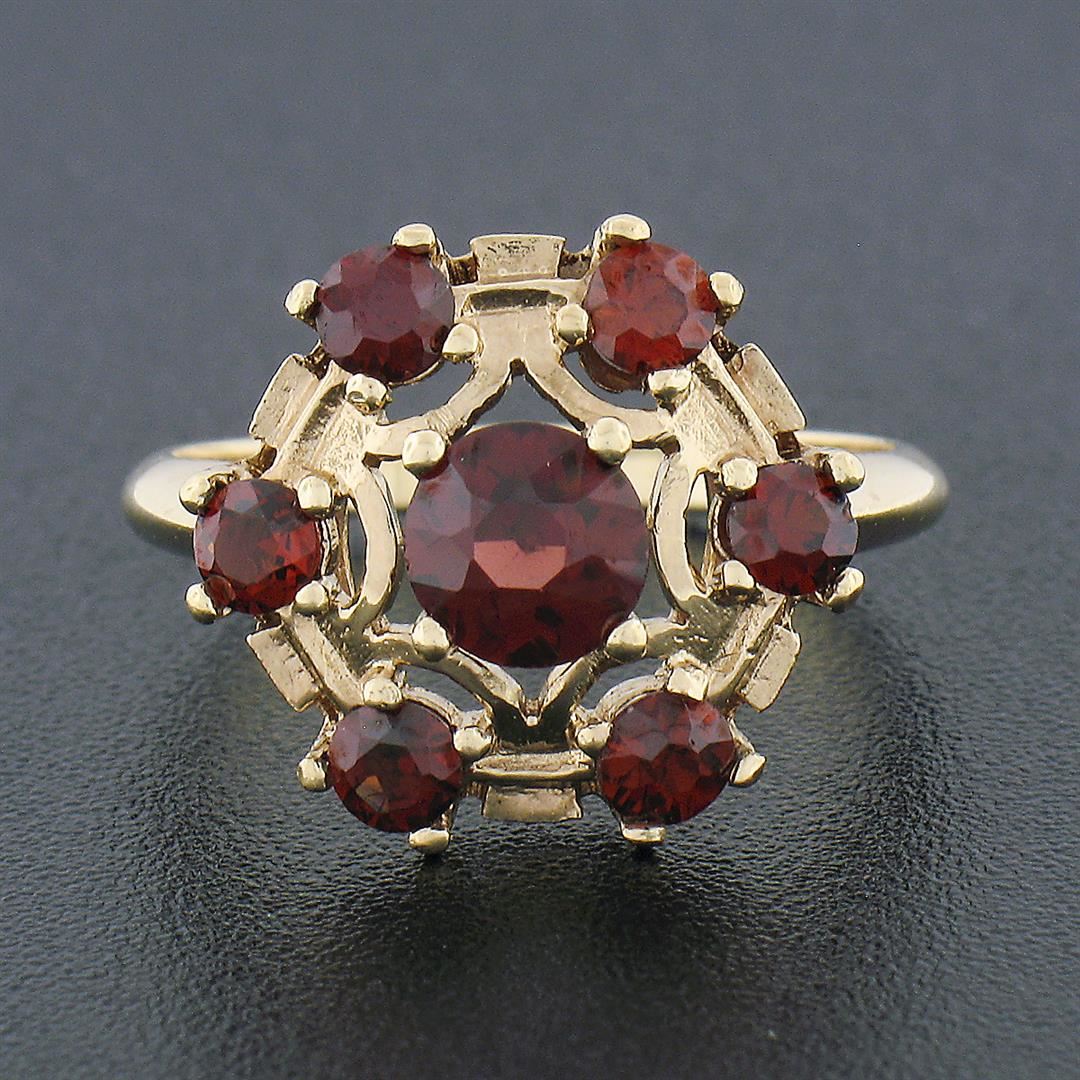 A solid 10k yellow gold cluster platter ring, with 7 round brilliant cut natural garnets (1.65ctw). The ring is size 6.0, weighs a total of 2.92 grams, and measures 13.80mm wide.