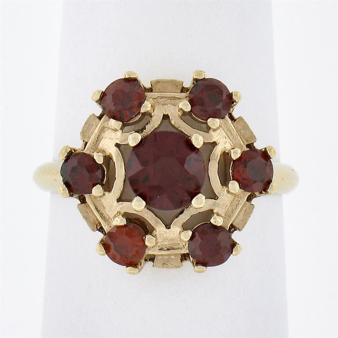 A solid 10k yellow gold cluster platter ring, with 7 round brilliant cut natural garnets (1.65ctw). The ring is size 6.0, weighs a total of 2.92 grams, and measures 13.80mm wide.