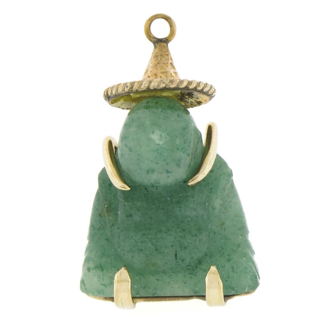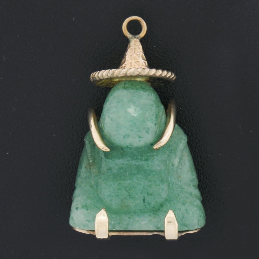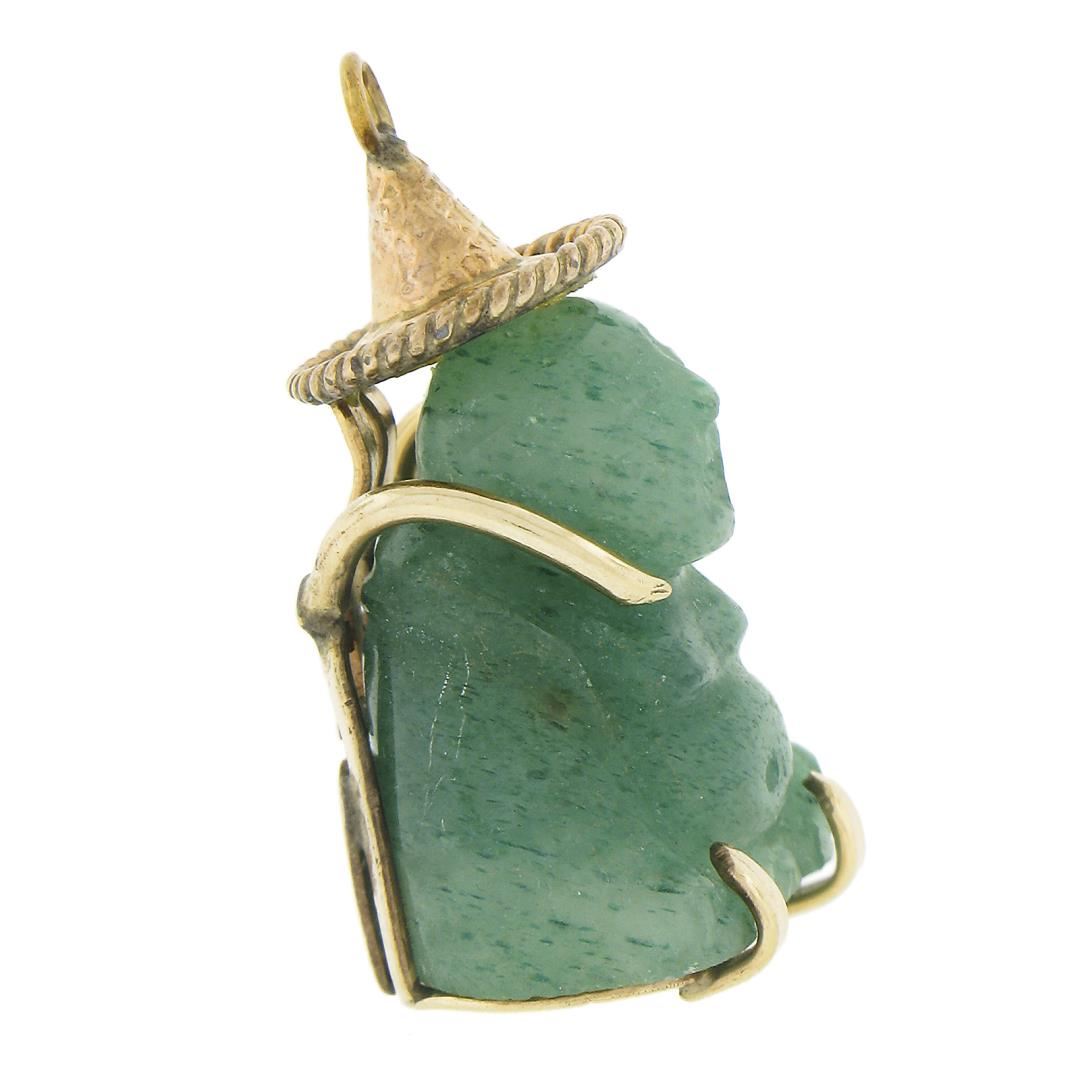 A vintage solid 10k yellow gold sculpture pendant, with carved natural jade (18.4x17.3mm). The pendant weighs a total of 6.55 grams, measures 28x17.3mm, and needs a jump ring.