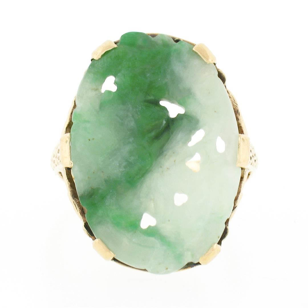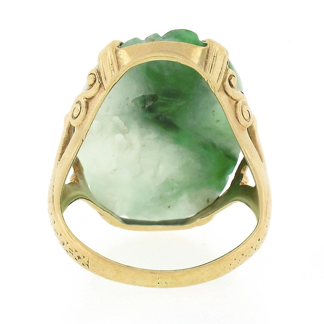 A vintage solid 10k yellow gold platter ring, with 1 oval carved natural jade (20.70x14.30mm). The ring is size 5.0, weighs a total of 3.58 grams, and measures 20.70mm wide.