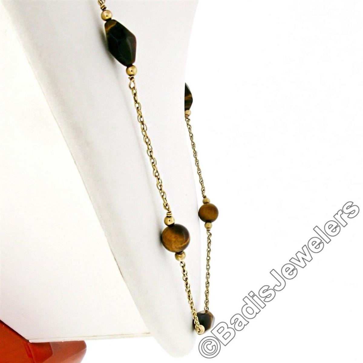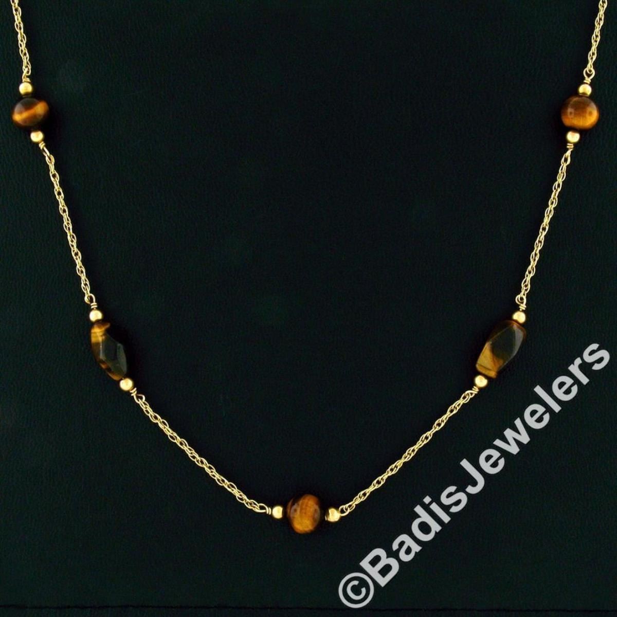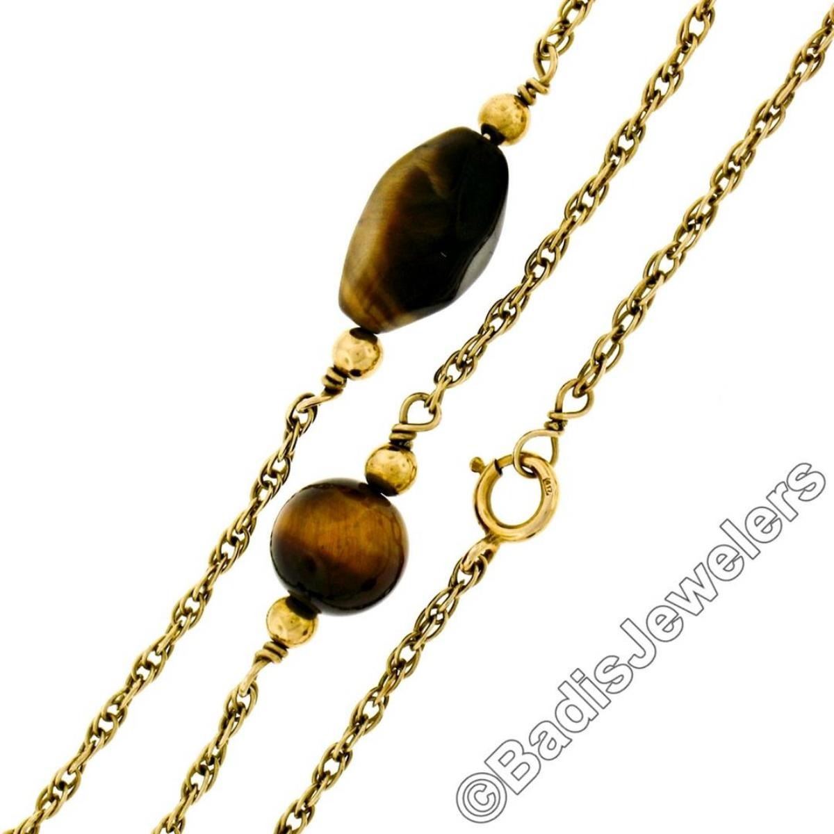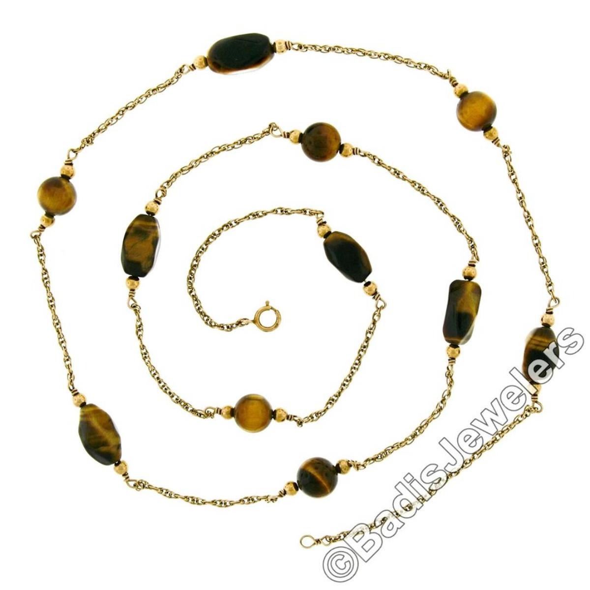 A vintage 10kt yellow gold necklace featuring 11 natural tiger's eye beads - 5 round (8.0mm) and 6 faceted custom cut (12.0x7.0mm). 26.5 inch chain, 14.33 grams total weight.