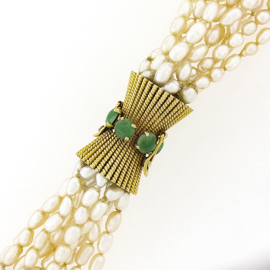 A vintage 11 strand necklace with 14k yellow gold clasp, featuring numerous od baroque shape freshwater pearls (4.70x3.50mm), and 6 round cabochon cut natural jade (4.75mm to 5.1mm each). 31 inch 11 strand link chain, 139.0 grams total weight, clasp measures 16.70mm in thickness.