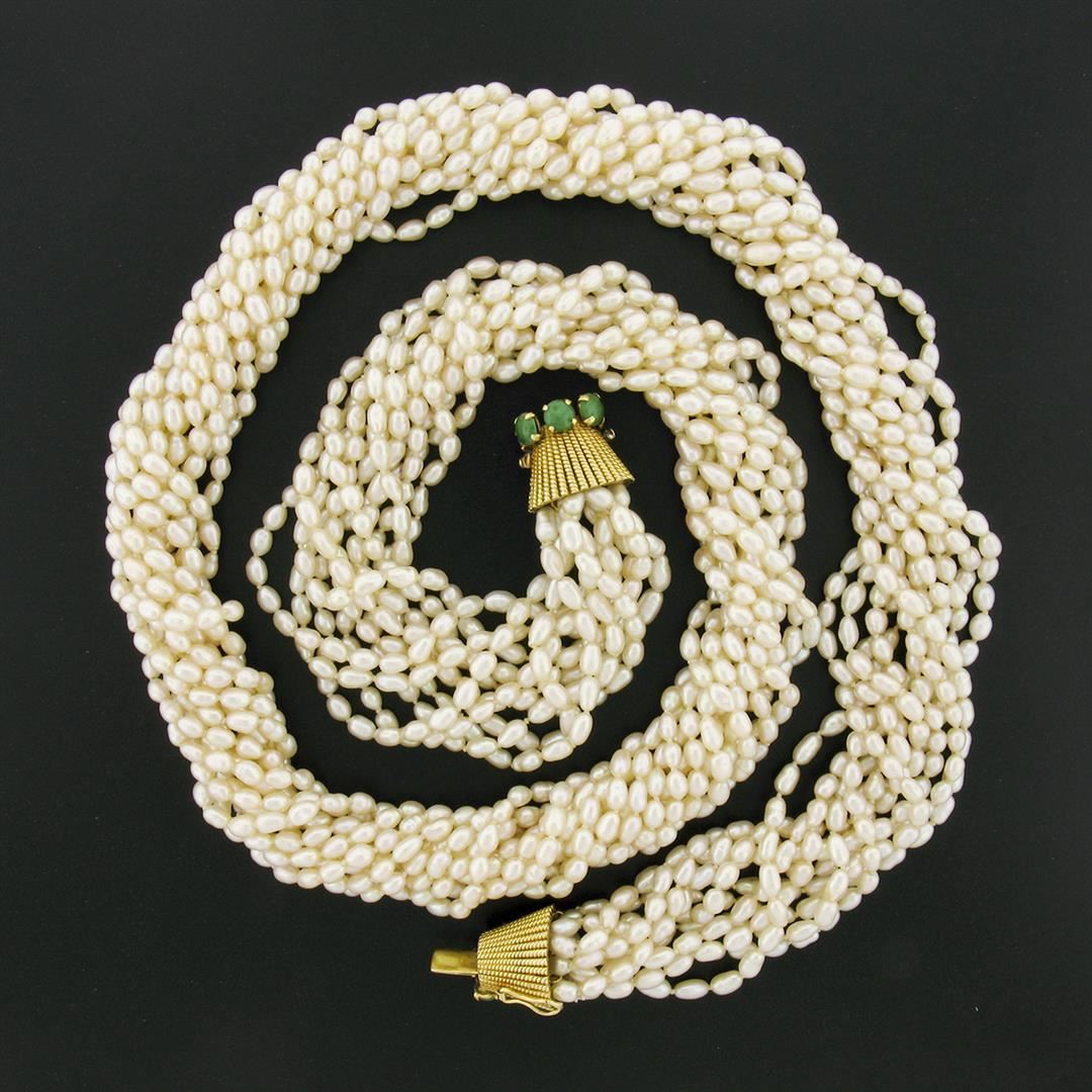 A vintage 11 strand necklace with 14k yellow gold clasp, featuring numerous od baroque shape freshwater pearls (4.70x3.50mm), and 6 round cabochon cut natural jade (4.75mm to 5.1mm each). 31 inch 11 strand link chain, 139.0 grams total weight, clasp measures 16.70mm in thickness.