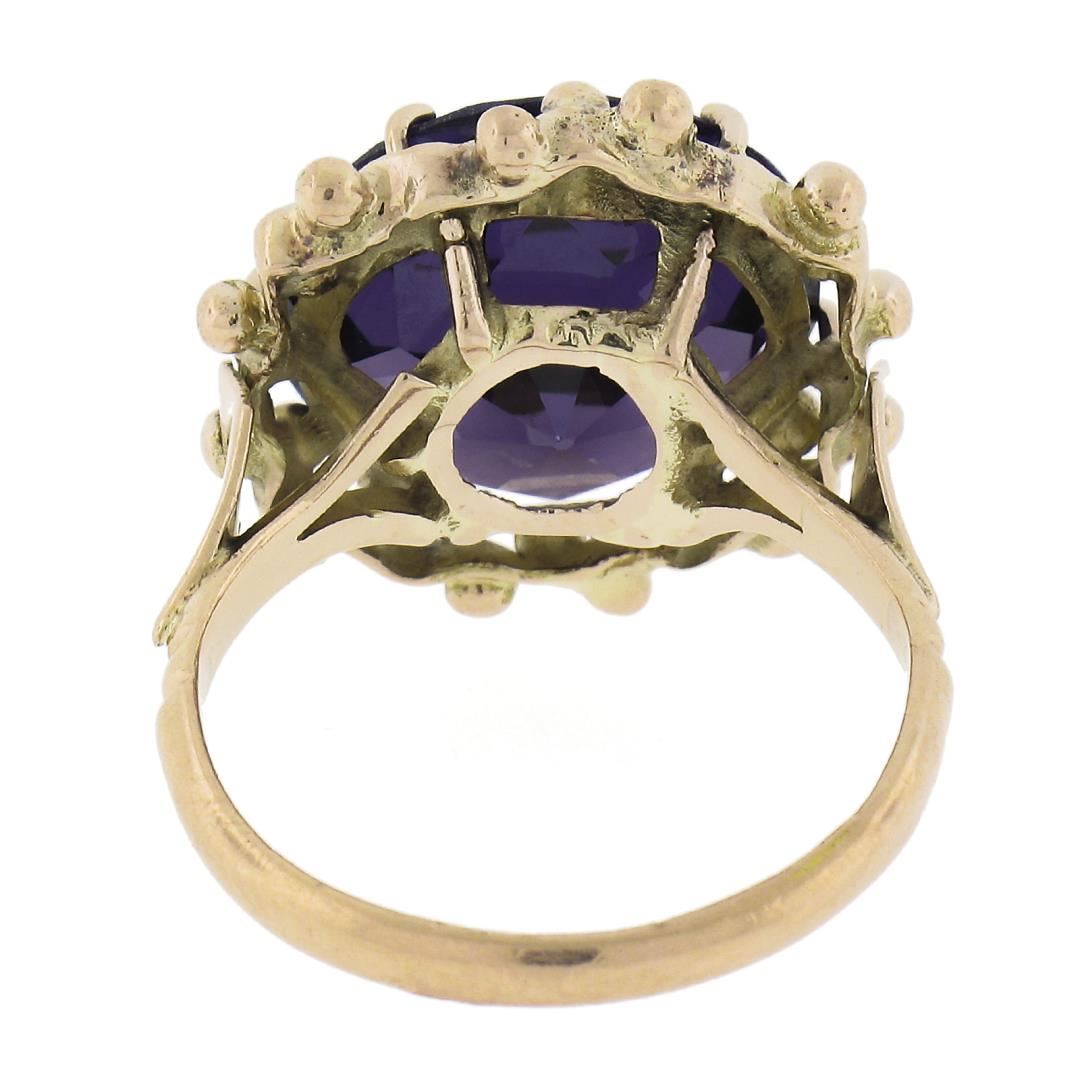 Vintage 12k Gold 15mm Round Synthetic Purple Stone Solitaire Ring w/ Bead Frame