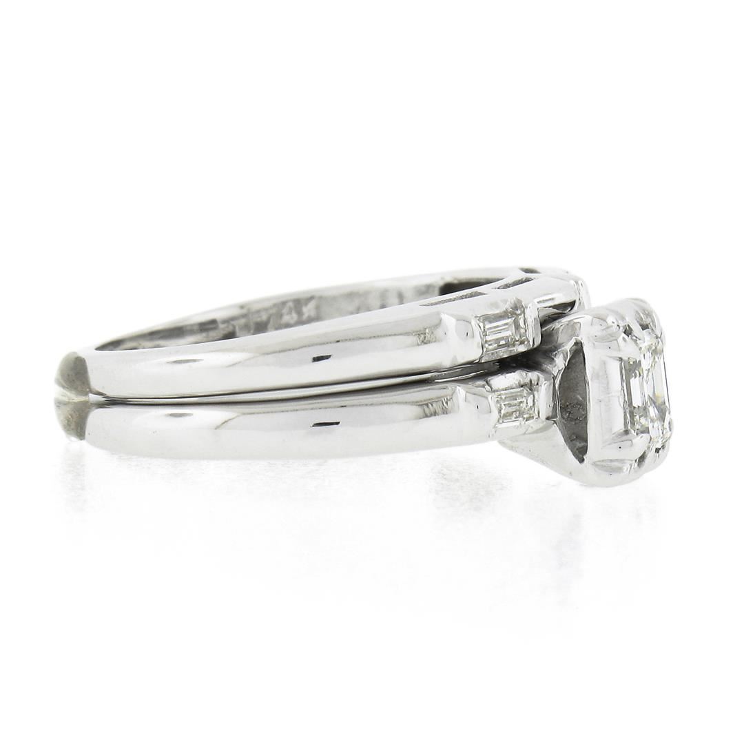 A vintage solid 14k white gold engagement and band ring set, with 1 emerald cut natural diamond (H - VS1 ; 4.6x3.6mm / 0.30ct), and 4 baguette cut natural diamonds (G/H - VS1/VS2 ; 0.20ctw). The ring is size 5.0, weighs a total of 3.39 grams, and measures 6.55mm wide.