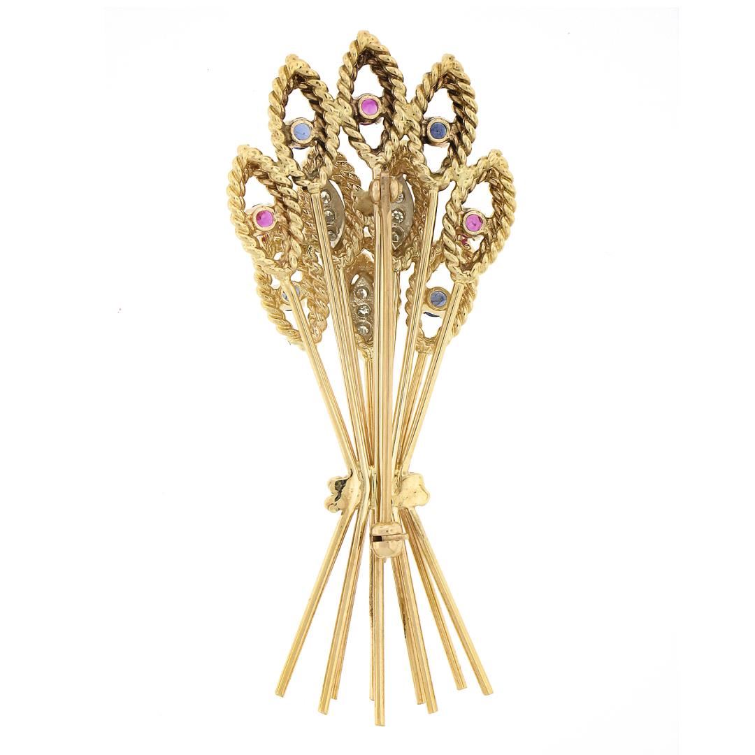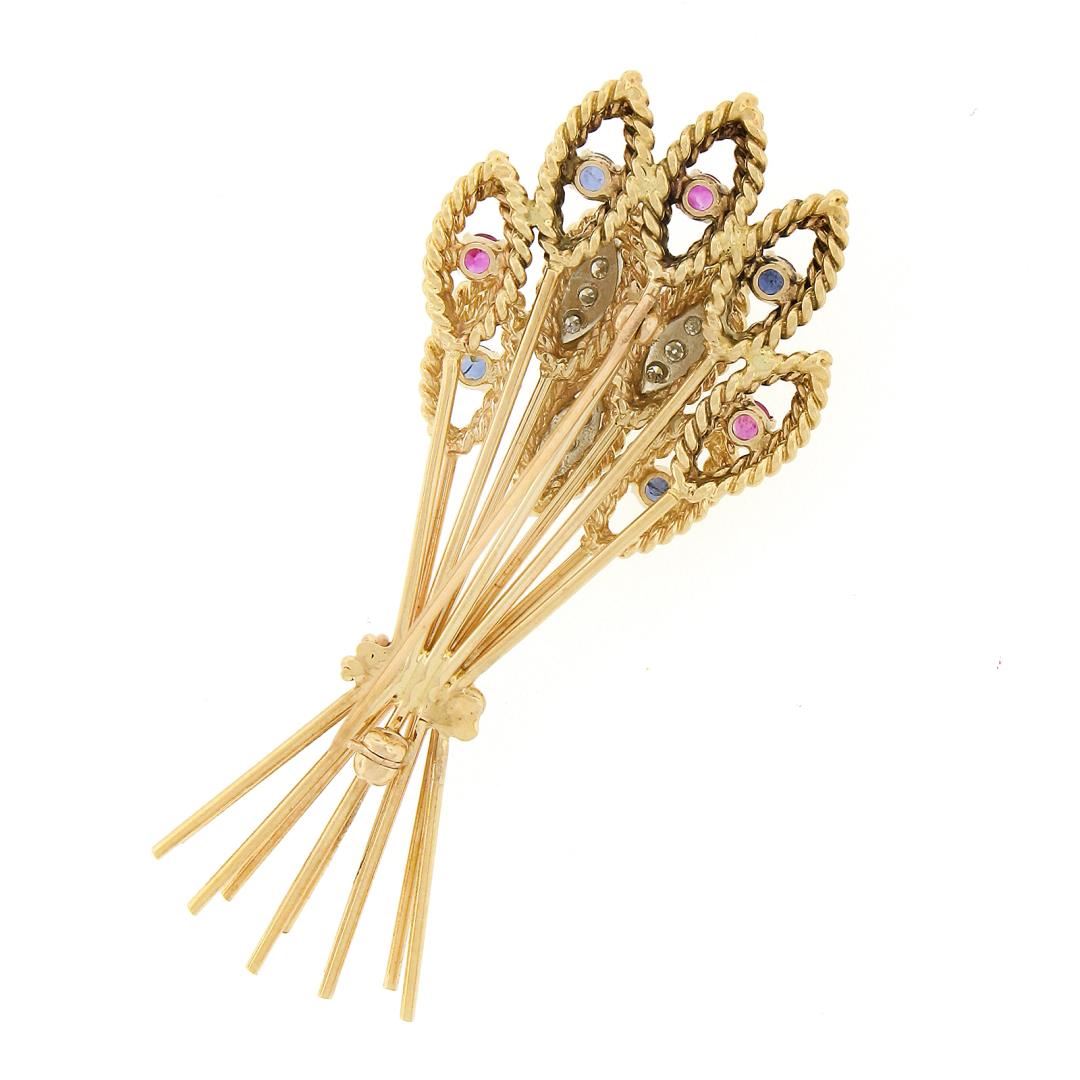 A vintage solid 14k yellow gold brooch, with 4 round brilliant cut natural sapphires (0.20ctw), and 3 round brilliant cut natural rubies (0.15ctw), and 9 single cut natural diamonds (I/J - VS2/SI1 ; 0.18ctw). Measures 62.65x26.30mm and weighs a total of 13.01 grams.