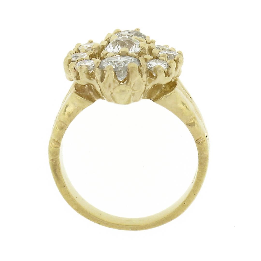 A solid 14k yellow gold ring, with 3 old european cut natural diamonds (H/ - SI1/I1 ; 0.90ctw), and 6 old transitional cut natural diamonds (H/I - VS2 ; 0.30ctw). The ring is size 2.0, weighs a total of 4.07 grams, and measures 17.75mm wide.