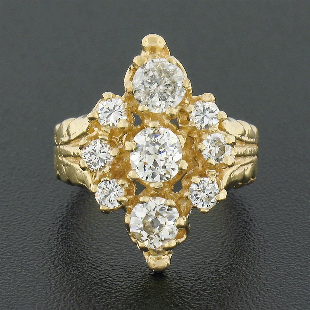 A solid 14k yellow gold ring, with 3 old european cut natural diamonds (H/ - SI1/I1 ; 0.90ctw), and 6 old transitional cut natural diamonds (H/I - VS2 ; 0.30ctw). The ring is size 2.0, weighs a total of 4.07 grams, and measures 17.75mm wide.