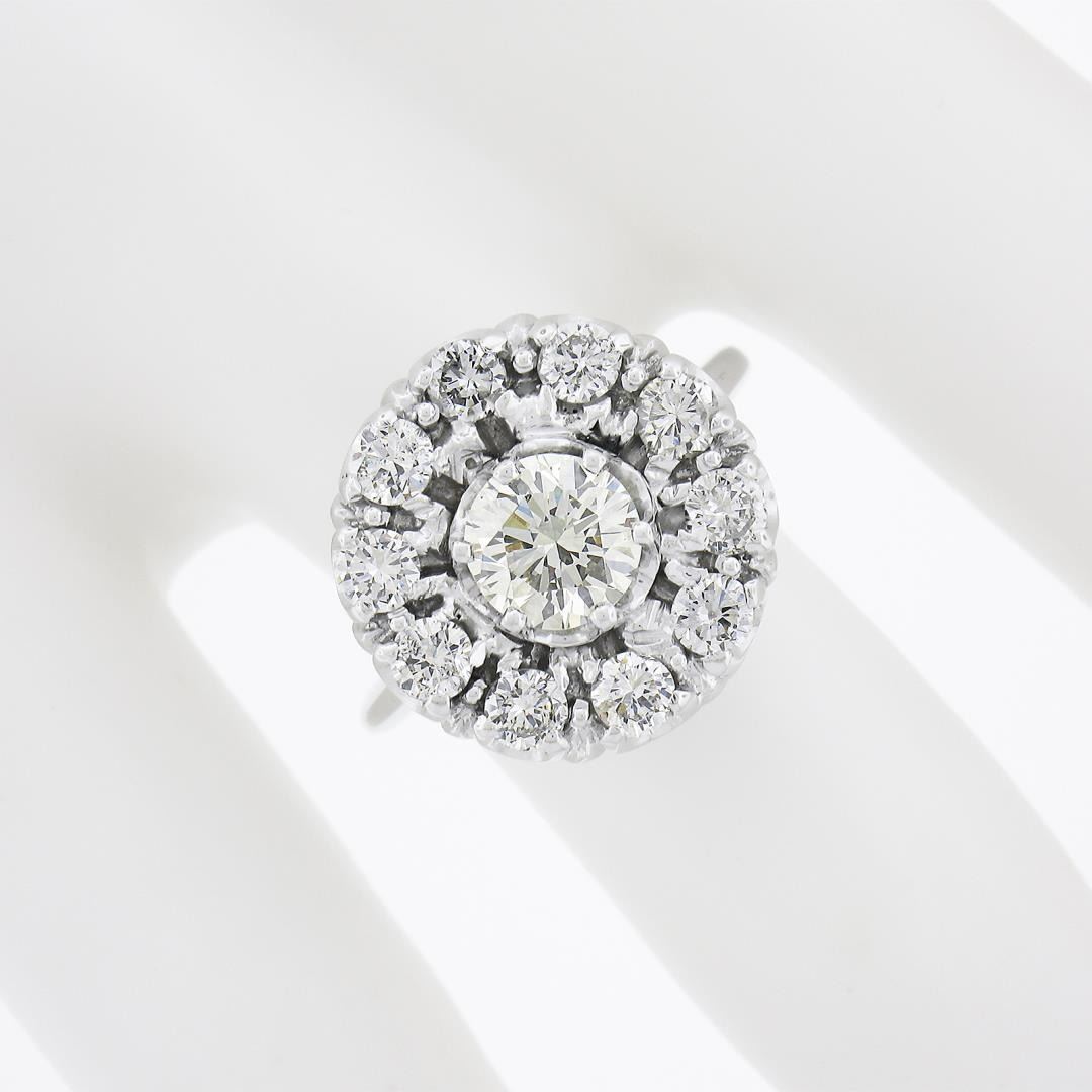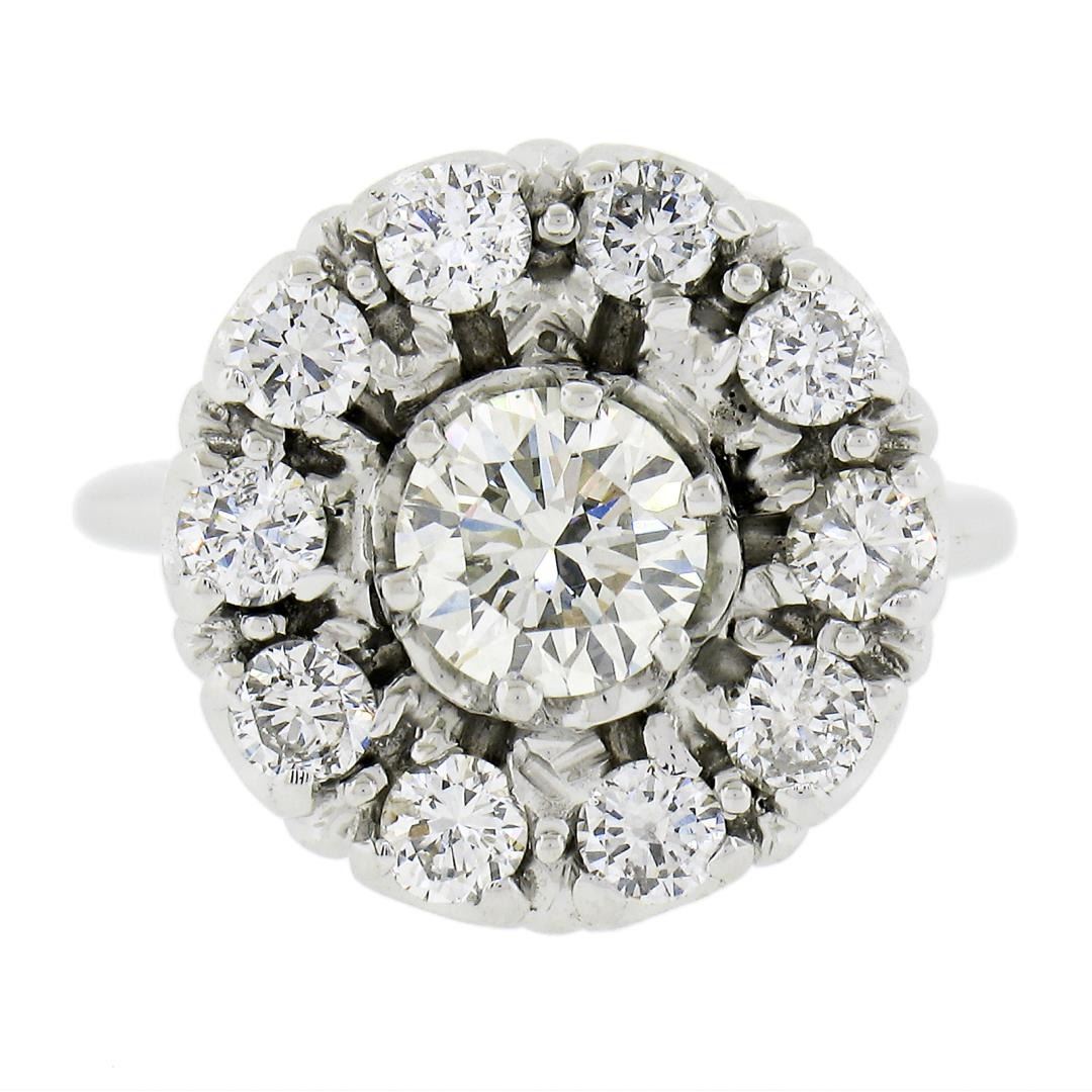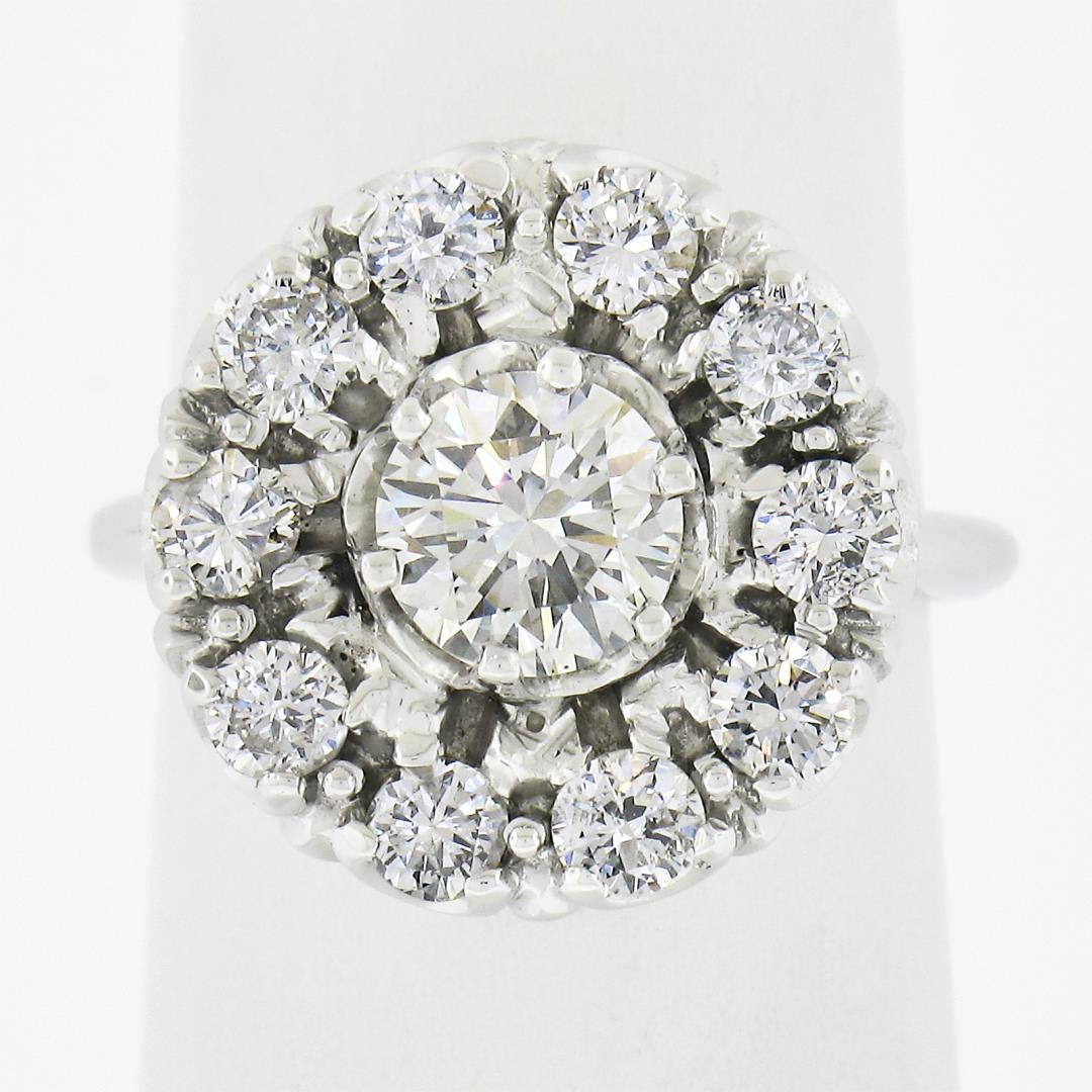 A vintage solid 14k white gold cluster ring, with 1 GIA graded round cut natural diamond (L - VS2 ; 0.85ct), surrounded with a halo of 10 round cut natural diamonds (G-I - SI1-I1 ; 0.90ctw). The ring is size 6.0, weighs a total of 5.62 grams, and measures 15.8mm wide. Comes with all original relevant certifications.