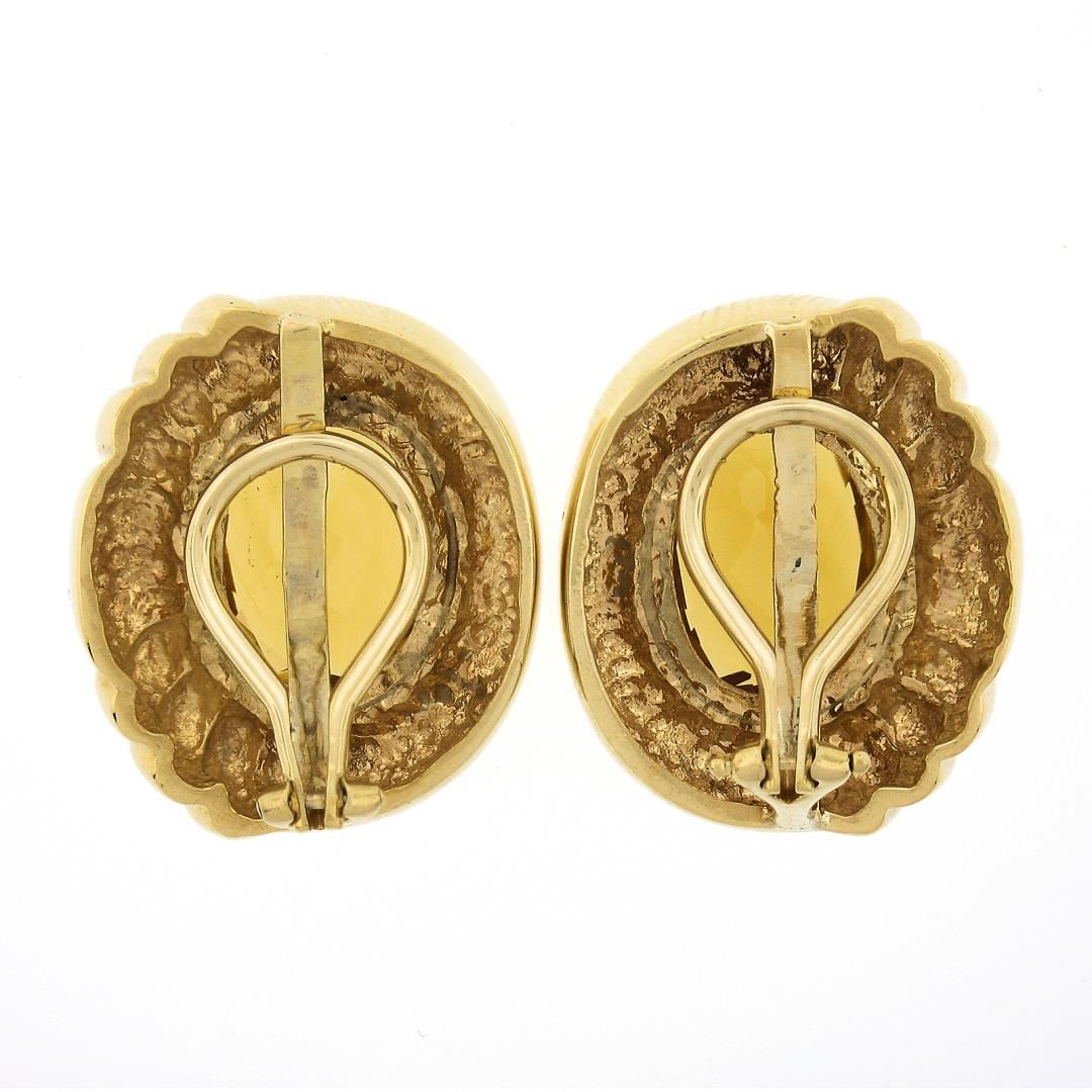 A vintage 14k yellow gold clip on earrings, with 2 oval cut natural citrines (11ctw). The earrings measure approximately 23.3x19.6mm and weigh a total of 20.43 grams.