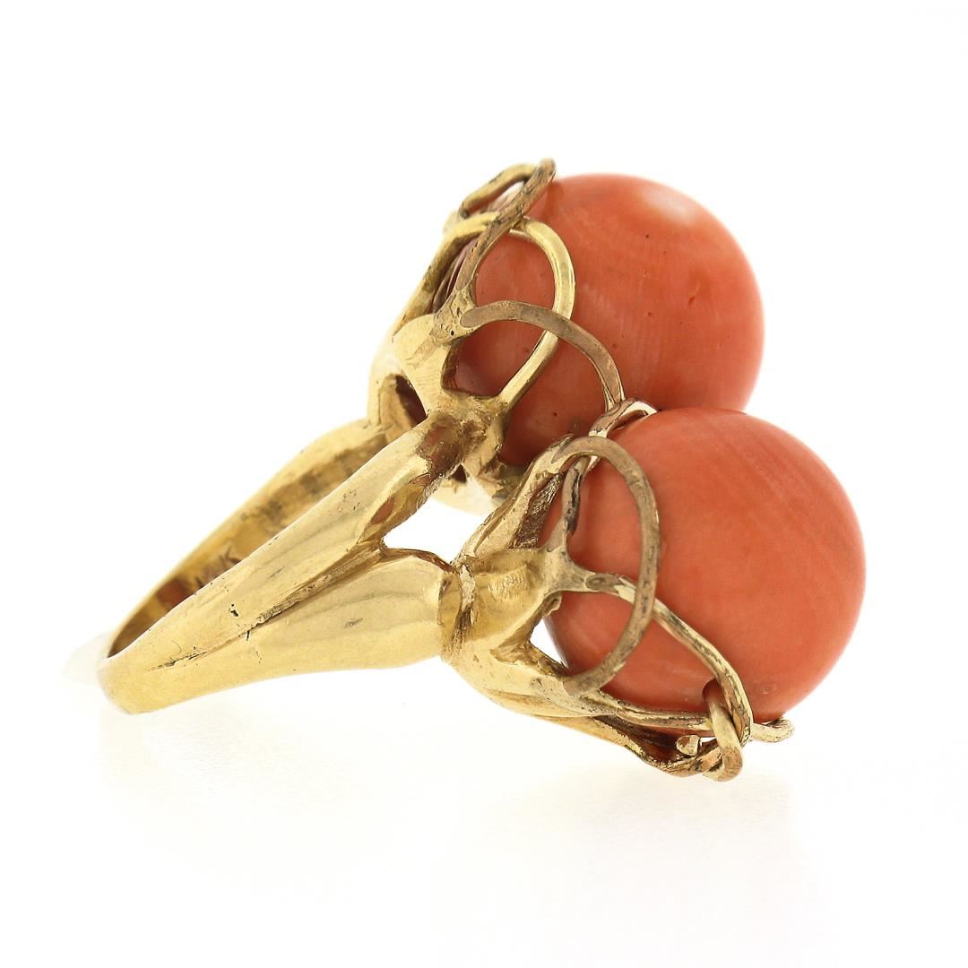 A vintage solid 14k yellow gold bypass ring, with 2 ball shape natural corals (12.4mm eac). The ring is size 4.5, weighs a total of 12.14 grams, and measures 23.3mm wide.