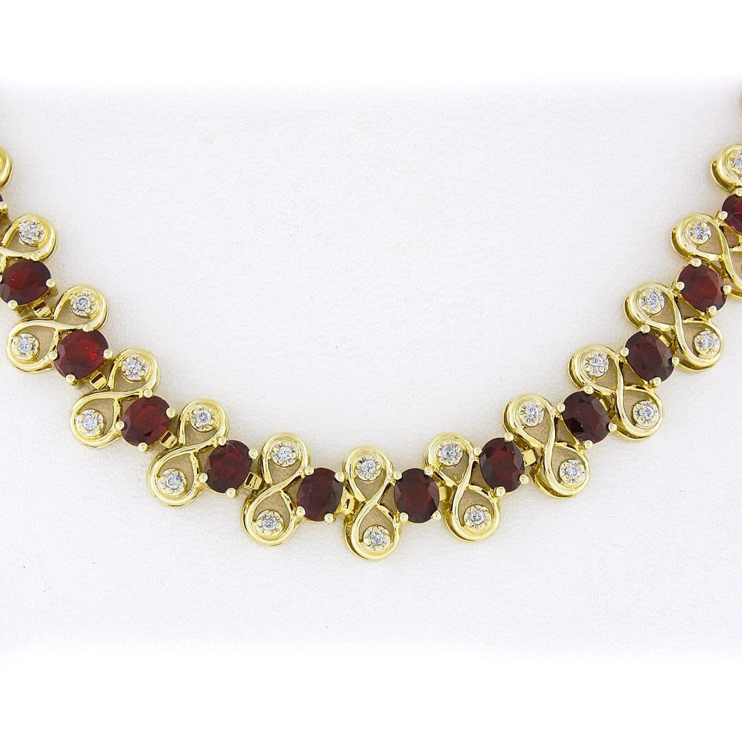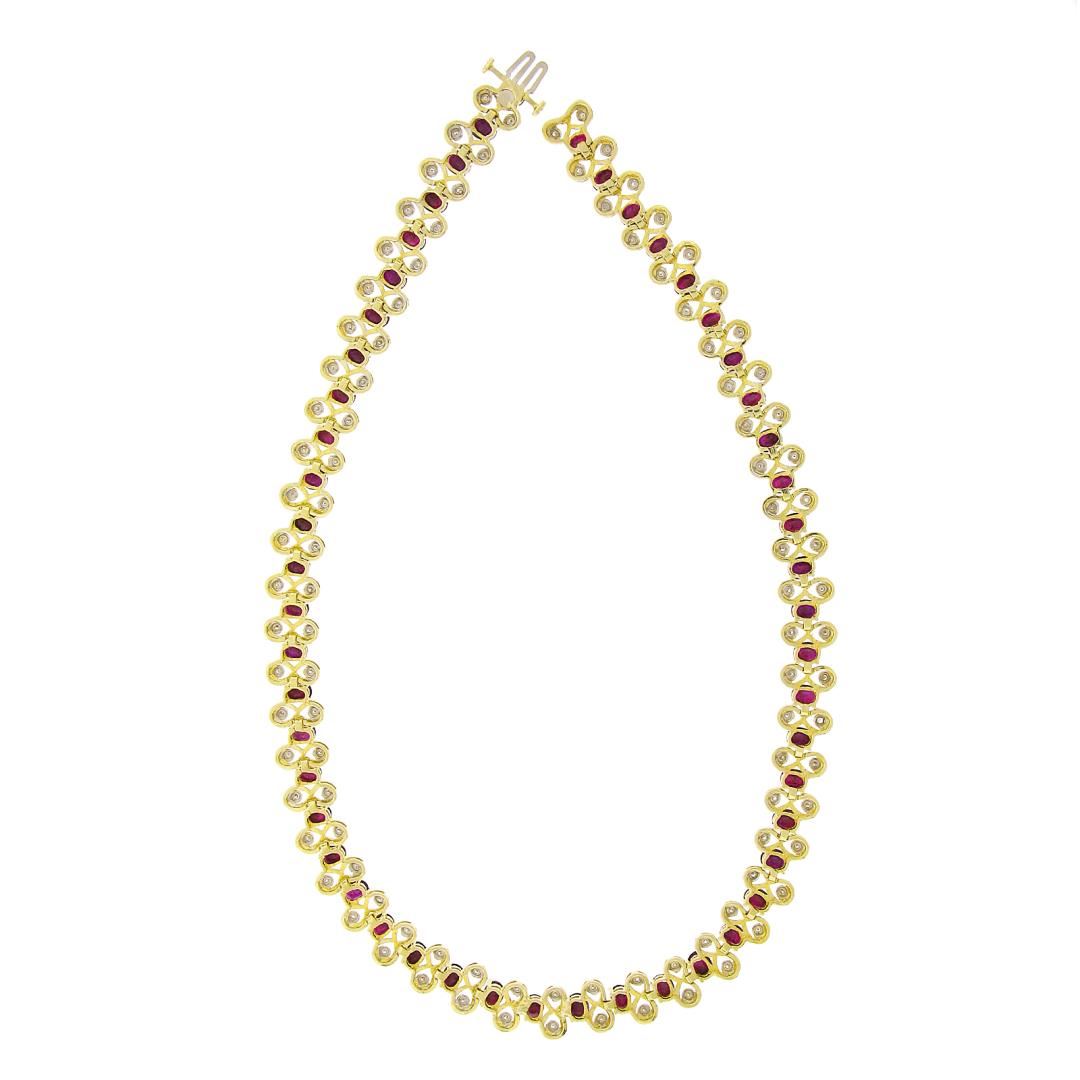 A vintage solid 14k yellow gold necklace, with GIA graded 51 oval cut natural rubies (20.0ctw), and 102 round cut natural diamonds (H/I - SI2/I1 ; 1.00ctw). It weighs a total of 40.80 grams, measures 10.8mm wide, and measures 16.5 inches in length. Comes with all original relevant certifications.
