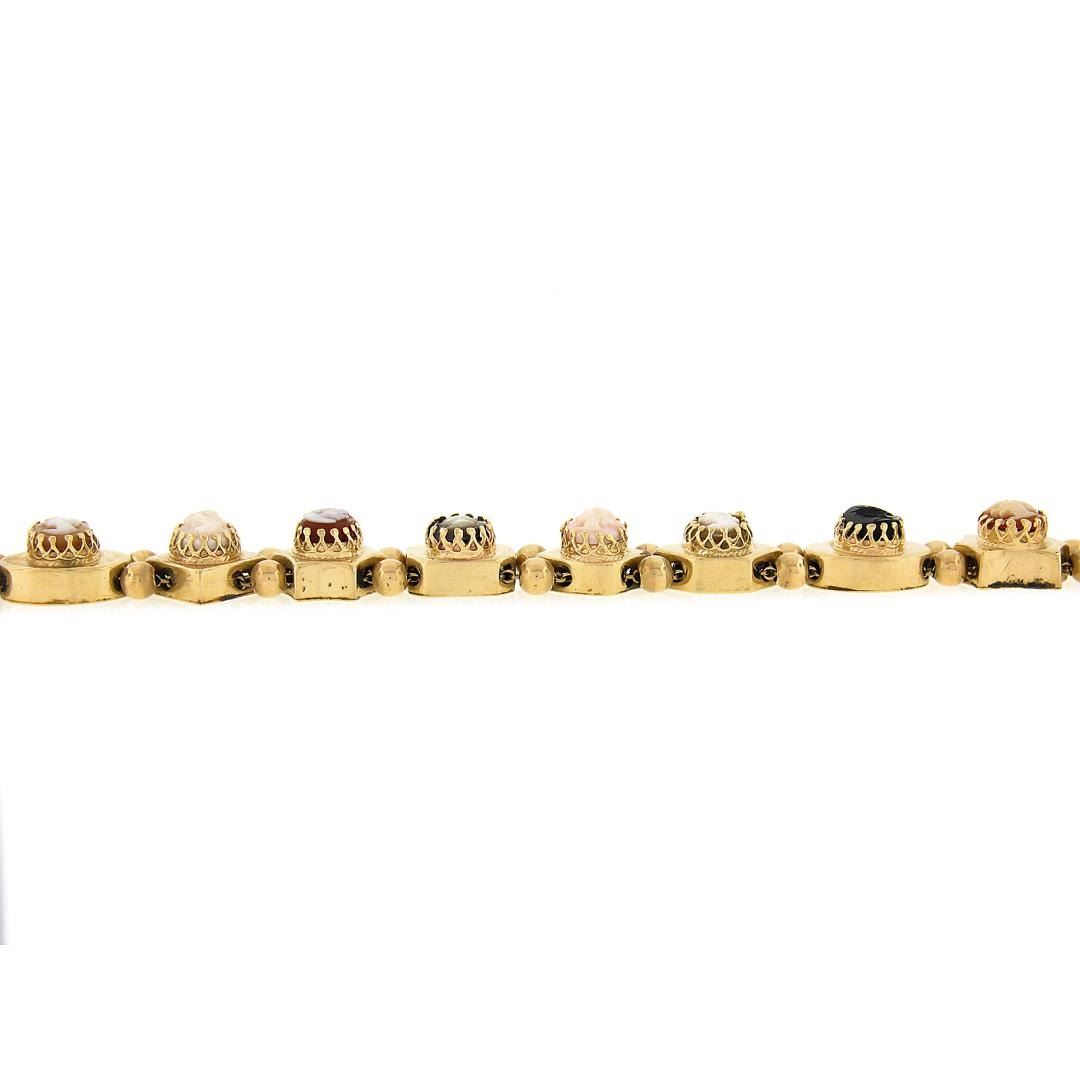 A vintage solid 14k yellow gold charm bracelet, with 12 oval carved cameo agate, mother of pearl, shell, & black onyx (8.3x6.1mm each ). It weighs a total of 25.12 grams, measures 13.25mm wide, and measures 6.25 inches in length.