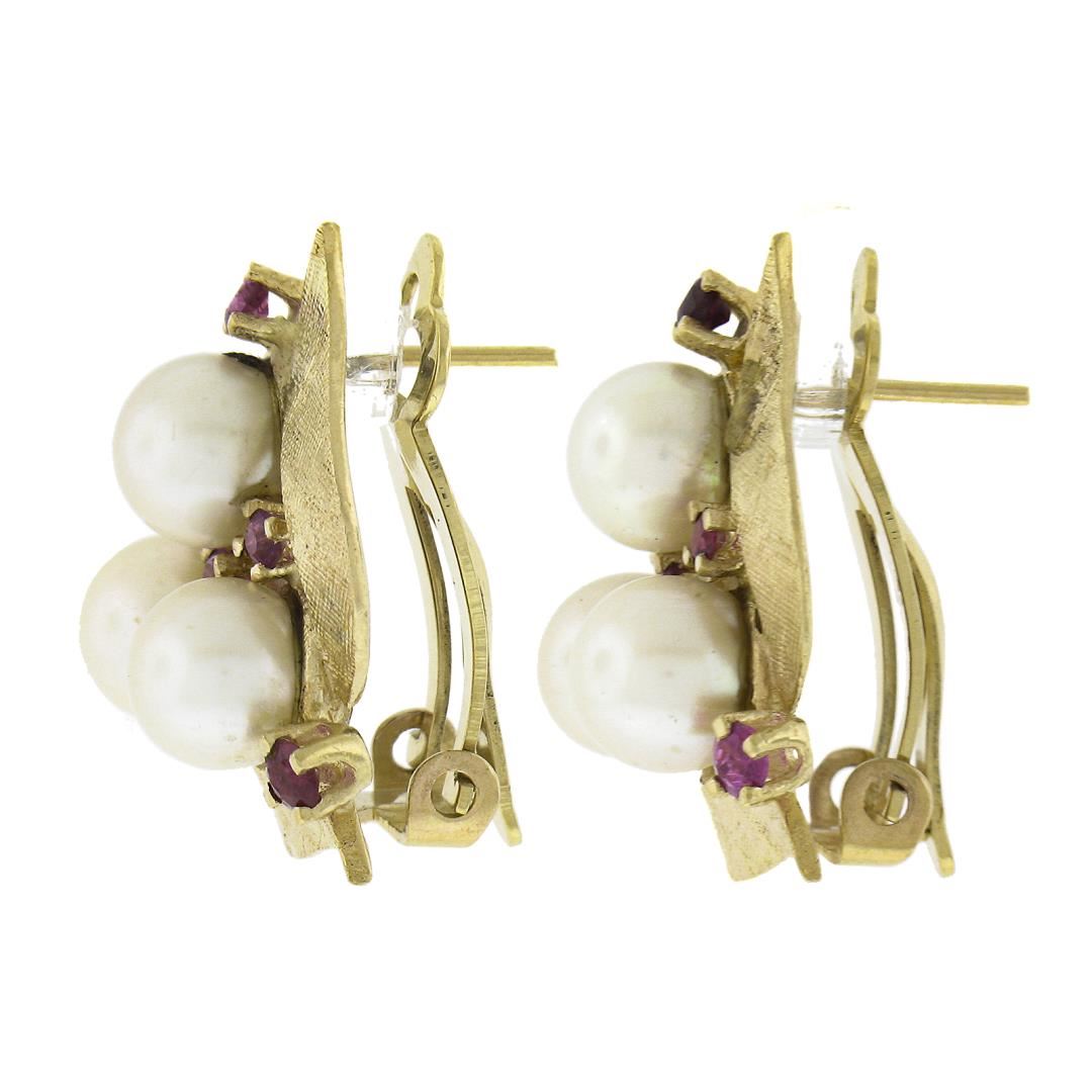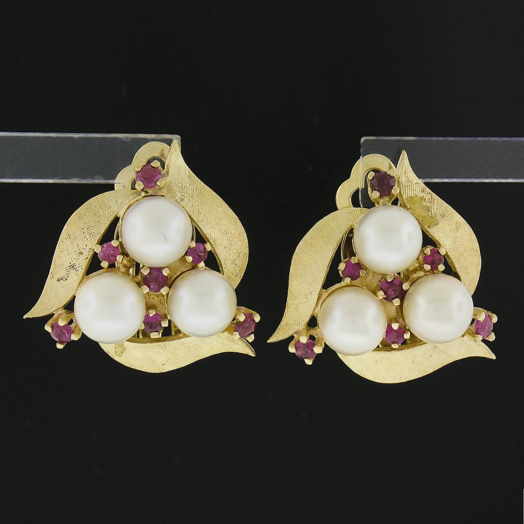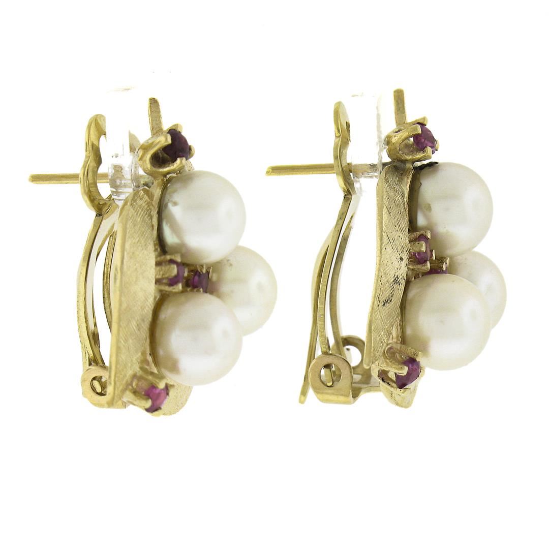 A vintage solid 14k yellow gold earrings, with 6 round shape cultured pearls ( 6.5mm each), and 14 round cut natural rubies (0.56ctw). The earrings measure approximately 22.6x22.5mm and weigh a total of 10.98 grams.
