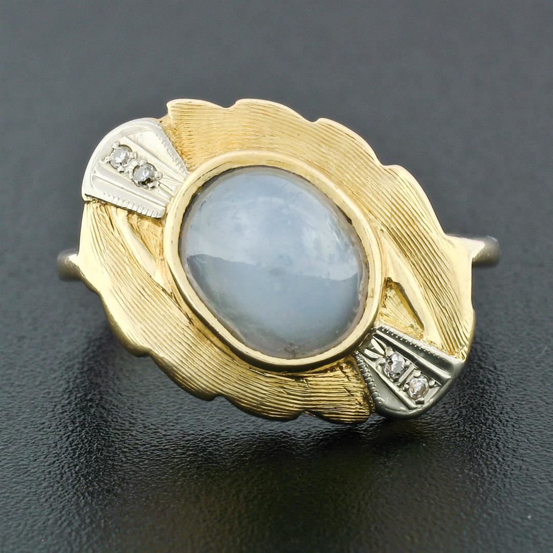 A vintage two tone solid 14k gold cocktail ring with a natural gray star sapphire (9.4x7.45mm; 6.81ct) accented by 4 old single cut natural diamonds (G/H - VS1/VS2; 0.04ctw). The ring is size 8.0, weighs a total of 7.25 grams, and measures 15.5mm wide.