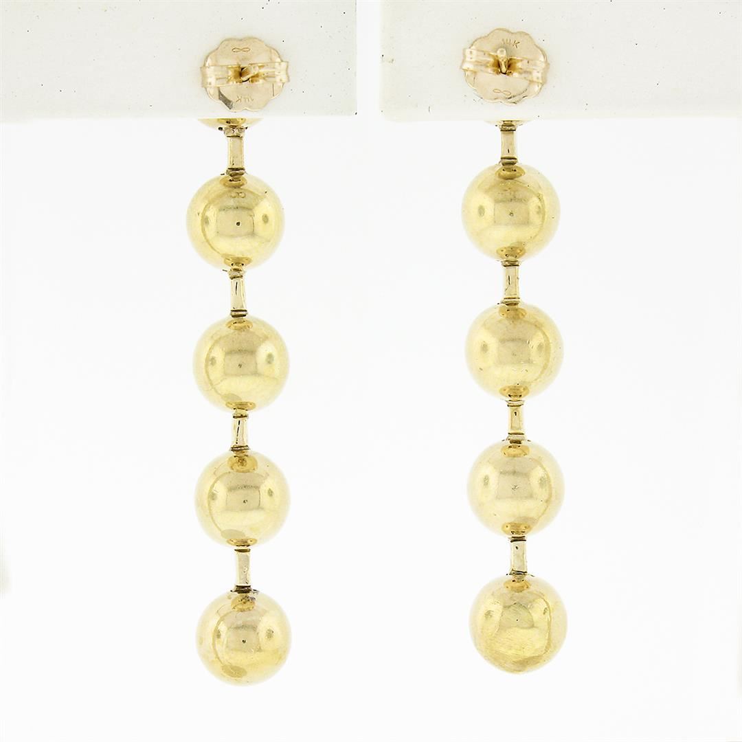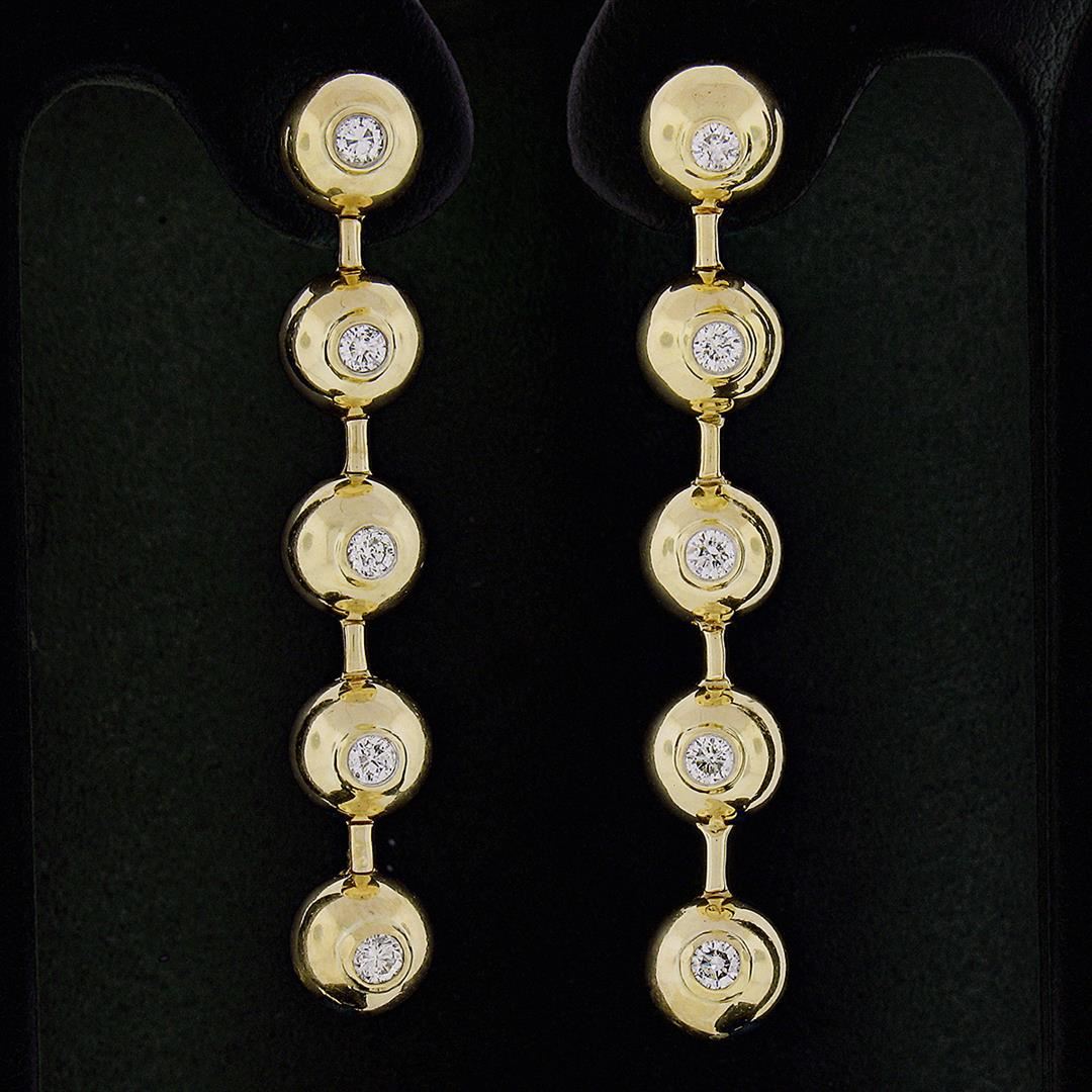 A pain of solid 14k yellow gold long drop earrings, with 10 round brilliant cut natural diamonds (G/H - SI1/SI2 ; 0.60ctw). The earrings measure approximately 48.30x7.2mm and weigh a total of 11.67 grams.