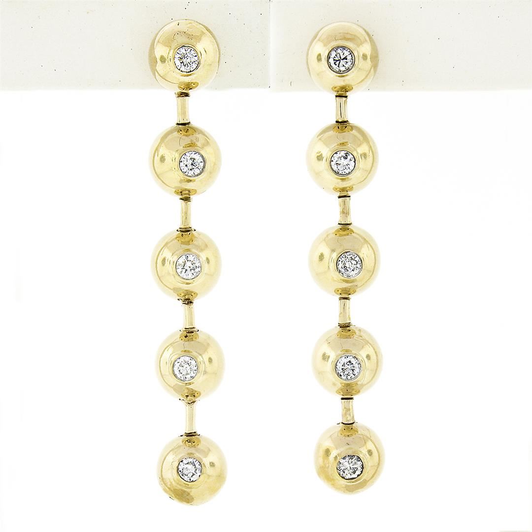 A pain of solid 14k yellow gold long drop earrings, with 10 round brilliant cut natural diamonds (G/H - SI1/SI2 ; 0.60ctw). The earrings measure approximately 48.30x7.2mm and weigh a total of 11.67 grams.