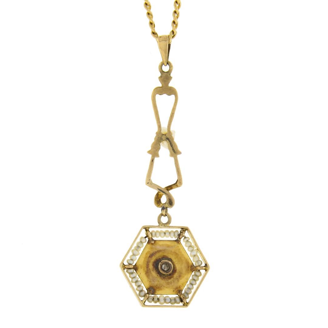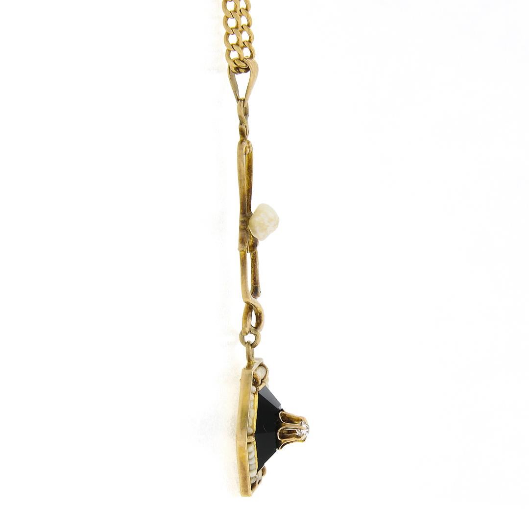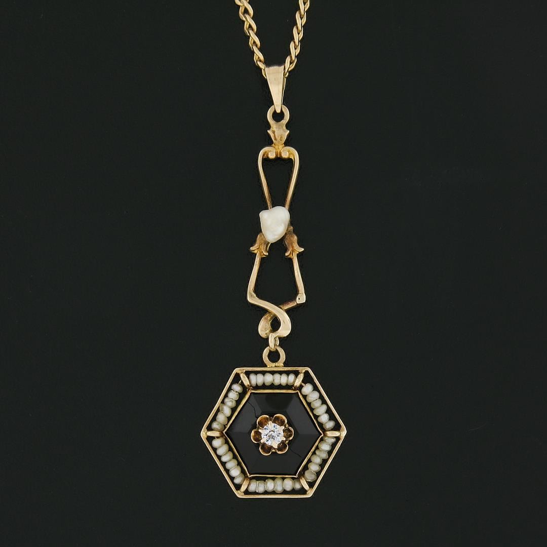 A vintage solid 14k yellow gold lavalier pendant necklace, with hexagon cut natural black onyx (7.6mm ), numerous of bead shape cultured seed pearls, 1 bnaroque shape cultured pearl (3.6x3mm), and 1 old cut natural white topaz (2.4mm). 15.5 inch curb link chain, 4.08 grams total weight, pendant measures 36.9x14.1mm.