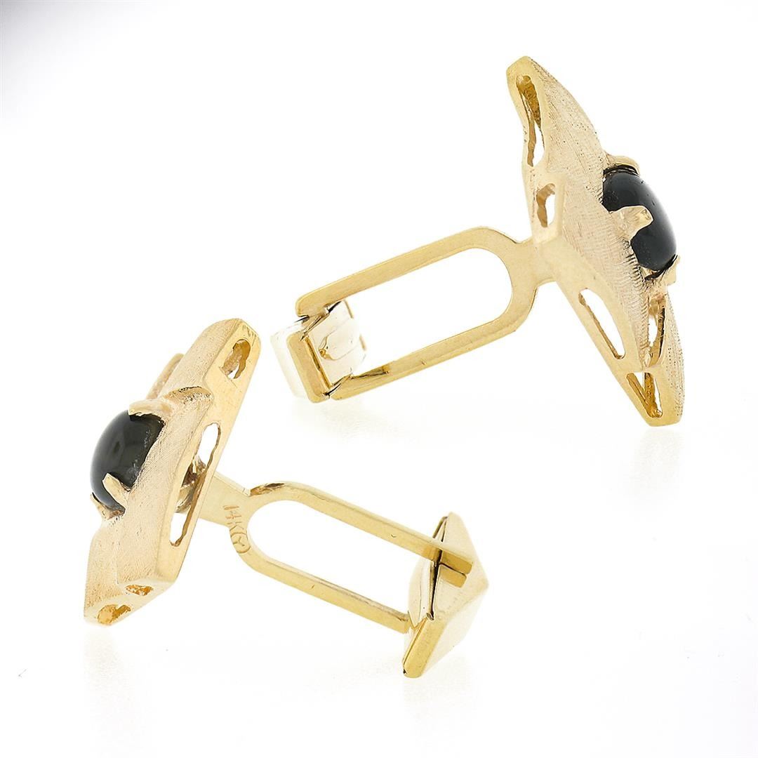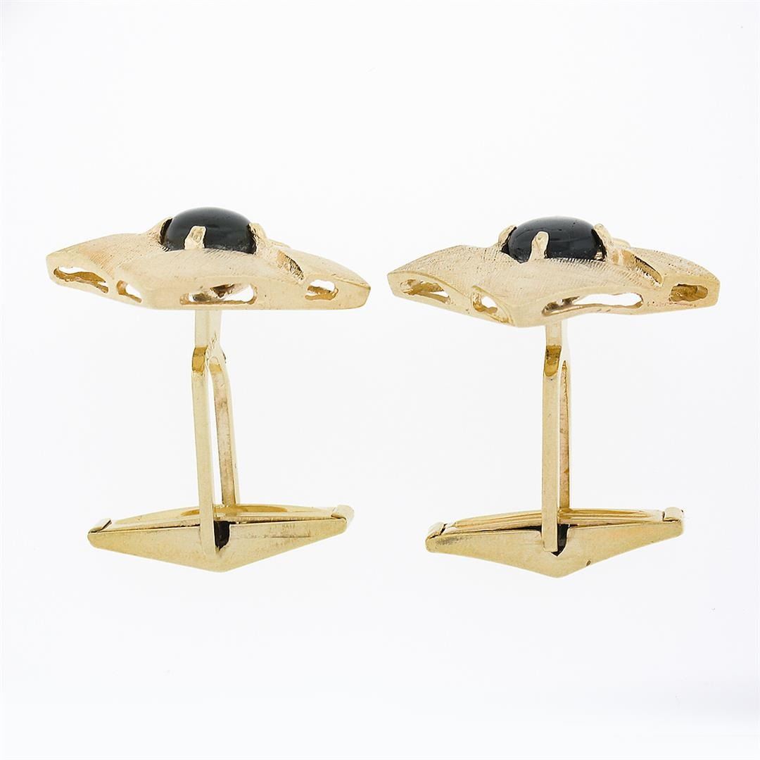 A vintage solid 14k yellow gold cufflinks, with 2 round cabochon cut natural brown star sapphires (6.2mm each). These cuff links have a swivel design with a clearance of 14.50mm, weigh a total of 9.70 grams, and the front panels measure 17.10x17.10mm.