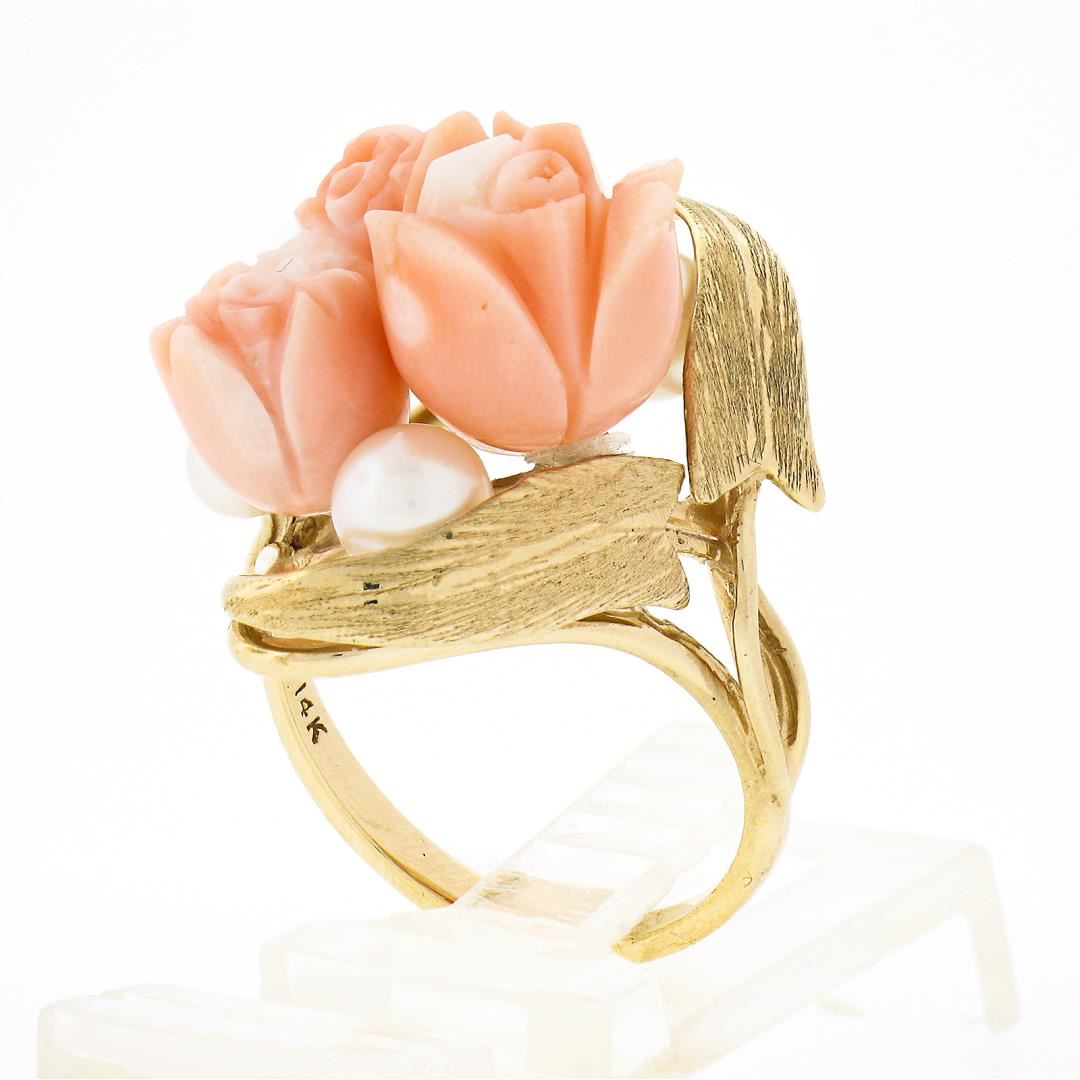 A vintage solid 14k yellow gold cocktail ring, with 3 carved rose flower shape genuine corals, and 6 round shape cultured pearls (5.2mm to 3.8mm each). The ring is size 7.5, weighs a total of 8.05 grams, and measures 25.10mm wide.