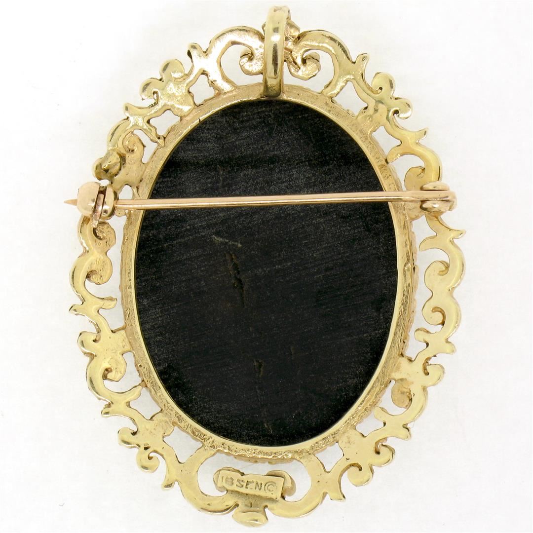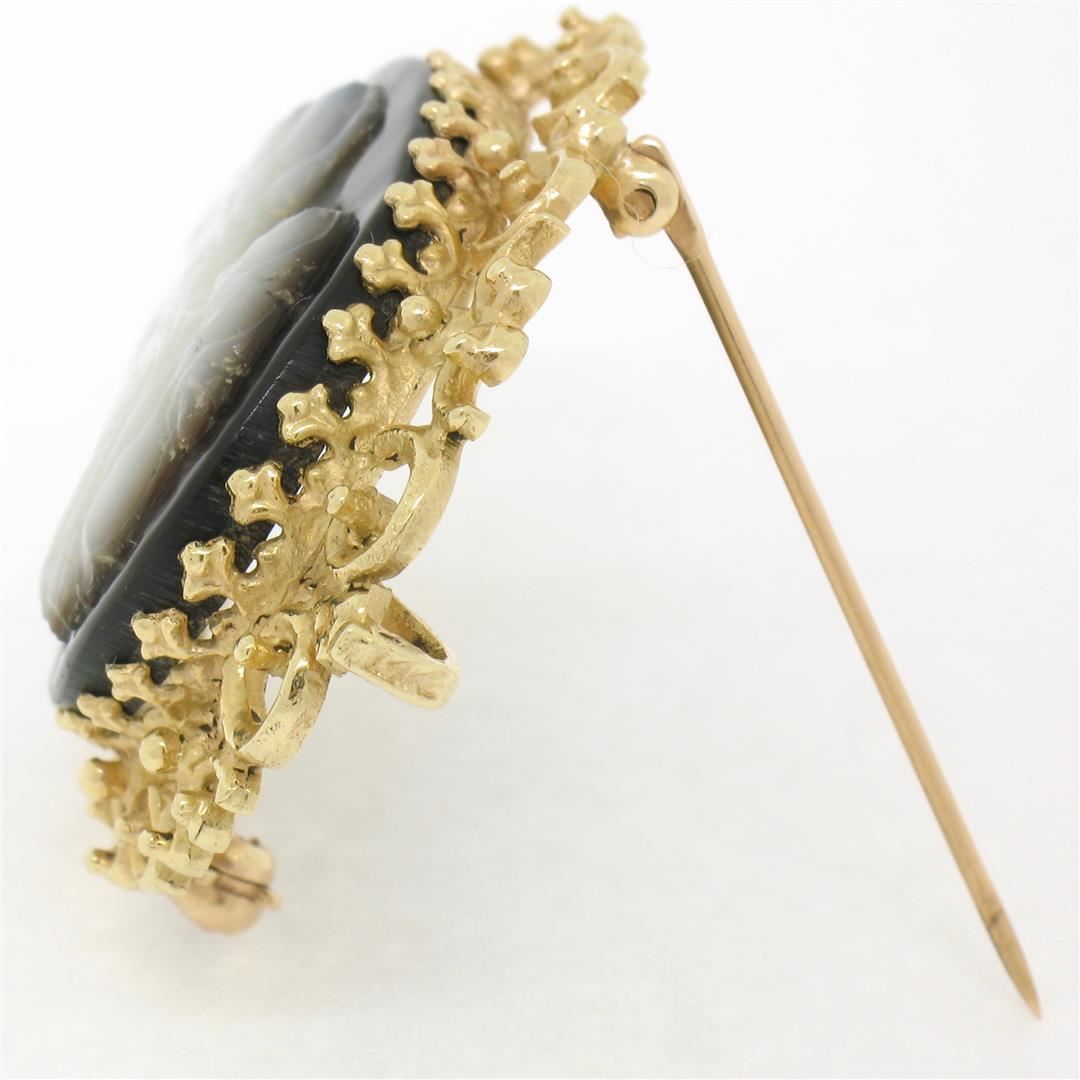 A vintage solid 14k yellow gold carved cameo pin brooch pendant, with 1 oval shape natural mother of pearl (30.50x23.50mm). Measures 42.60x32.30mm and weighs a total of 13.49 grams.
