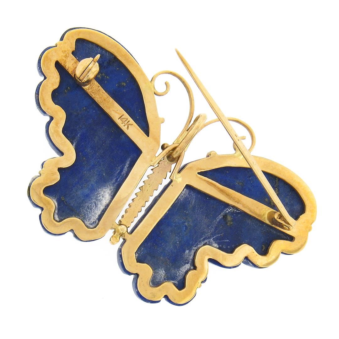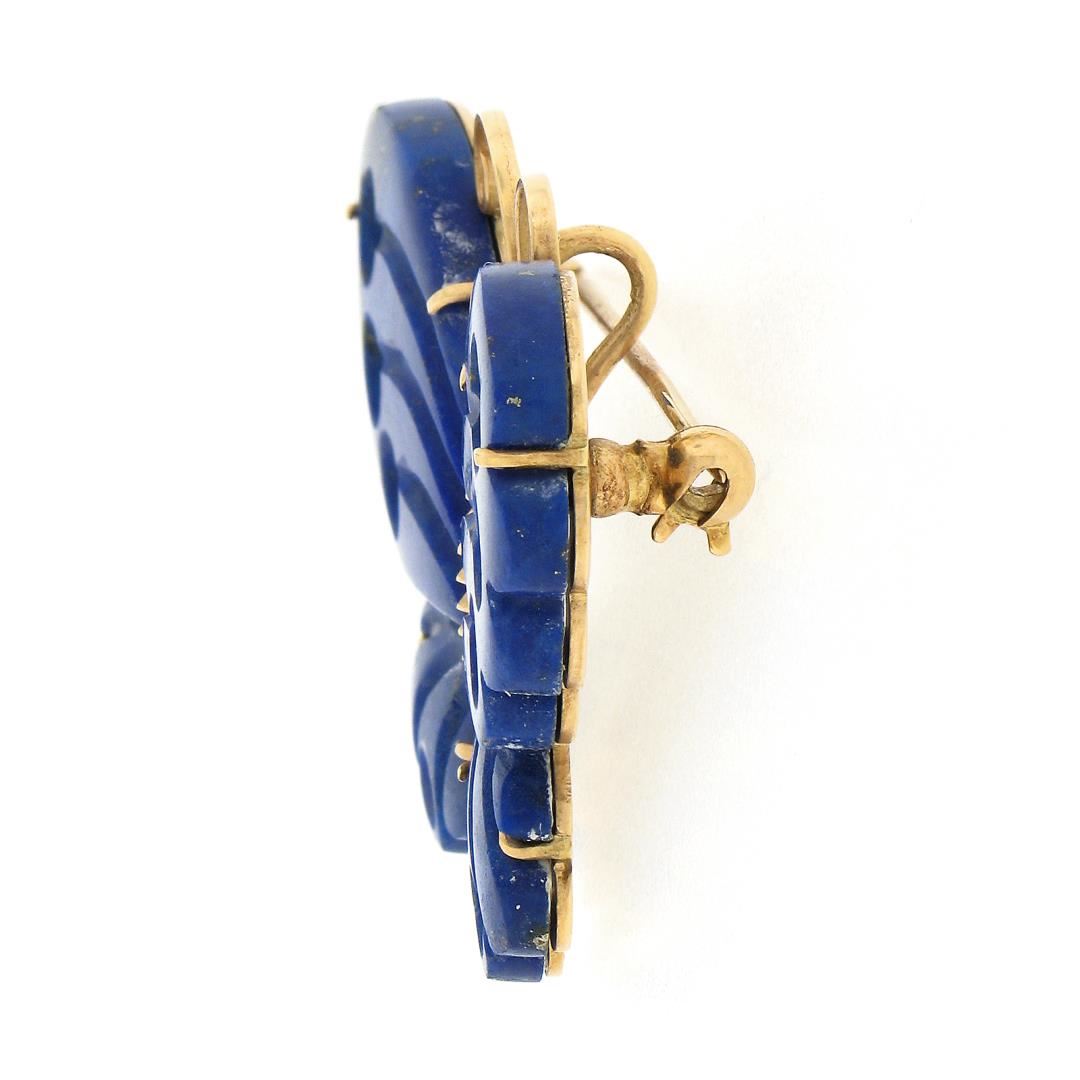 A vintage solid 14k yellow gold brooch pendant, with 2 custom cut carved natural lapis lazuli (30x22.3mm each). Measures 30.5x48.4mm and weighs a total of 11.75 grams.
