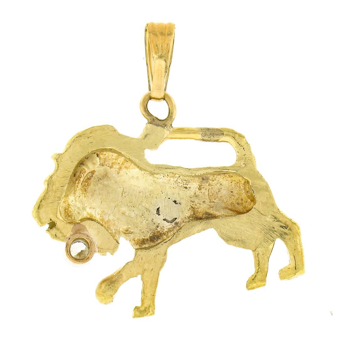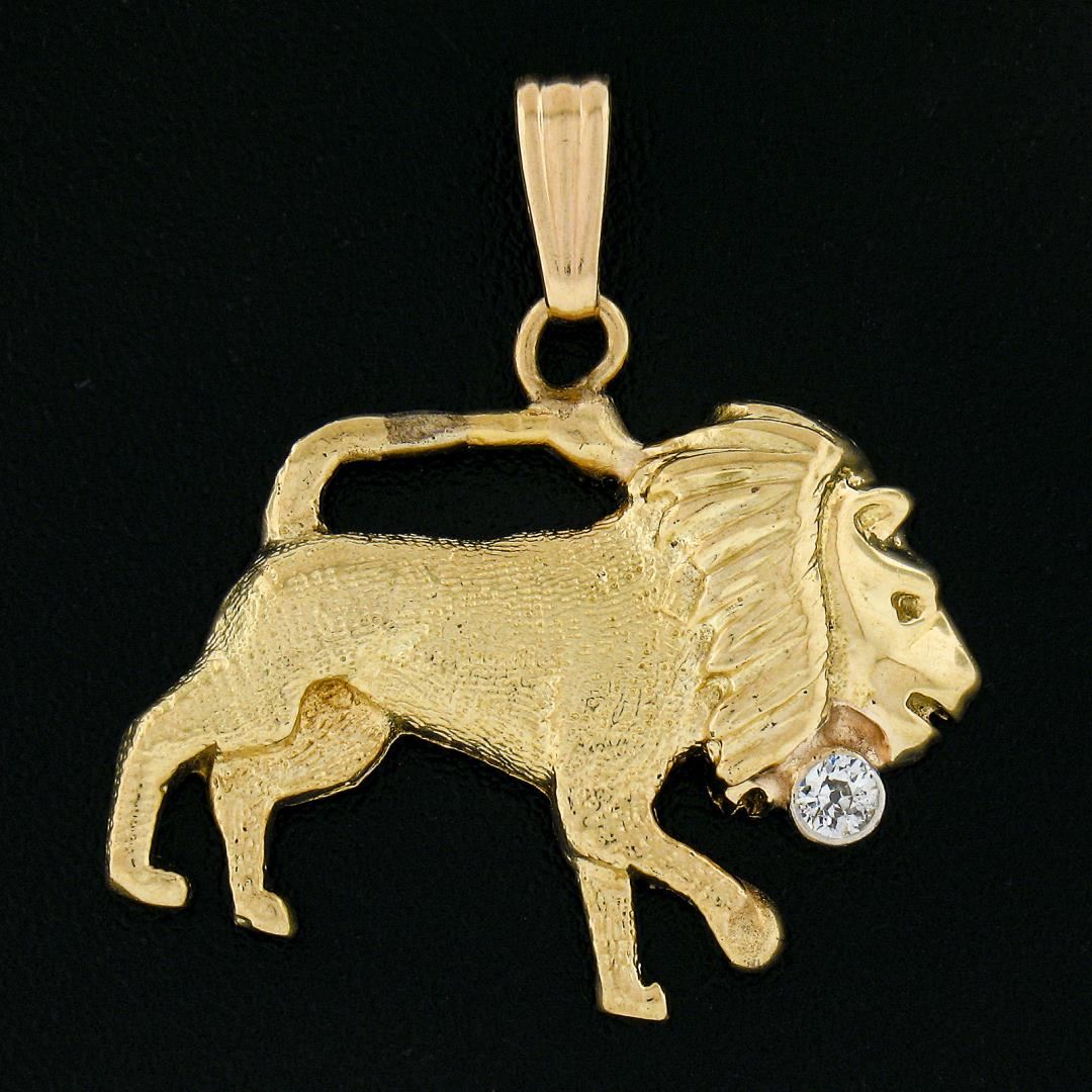 A vintage 14k yellow gold lion charm pendant, with 1 old european cut natural diamond (G - SI1 ; 0.05ct). The pendant weighs a total of 4.0 grams, measures 25.60x24.4mm including the bail, and the inside of the bail measures 5.6x2.2mm.