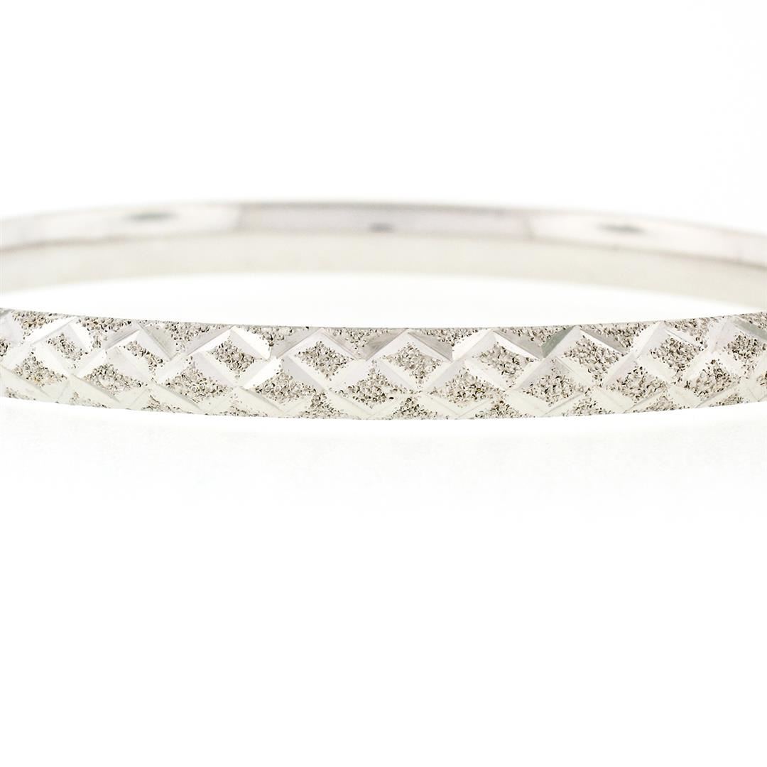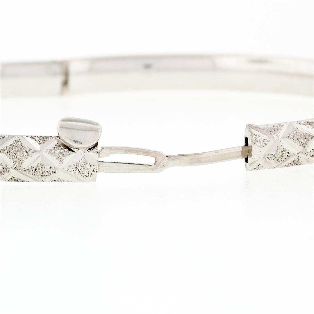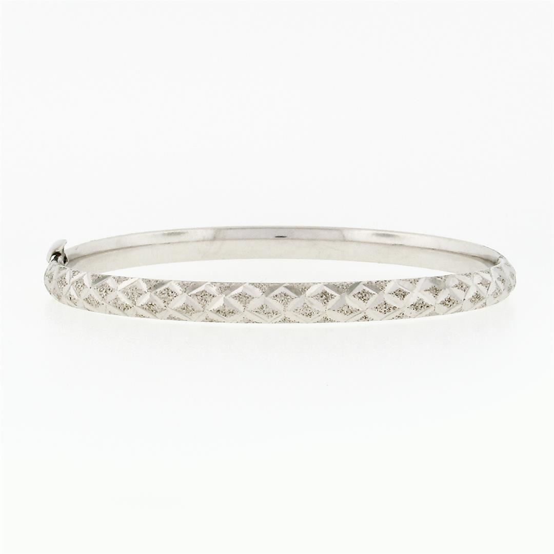 A vintage solid 14k white gold textured slip on bangle bracelet. It weighs a total of 6.86 grams, measures 60.3mm wide, and measures 6.5 inches in length.