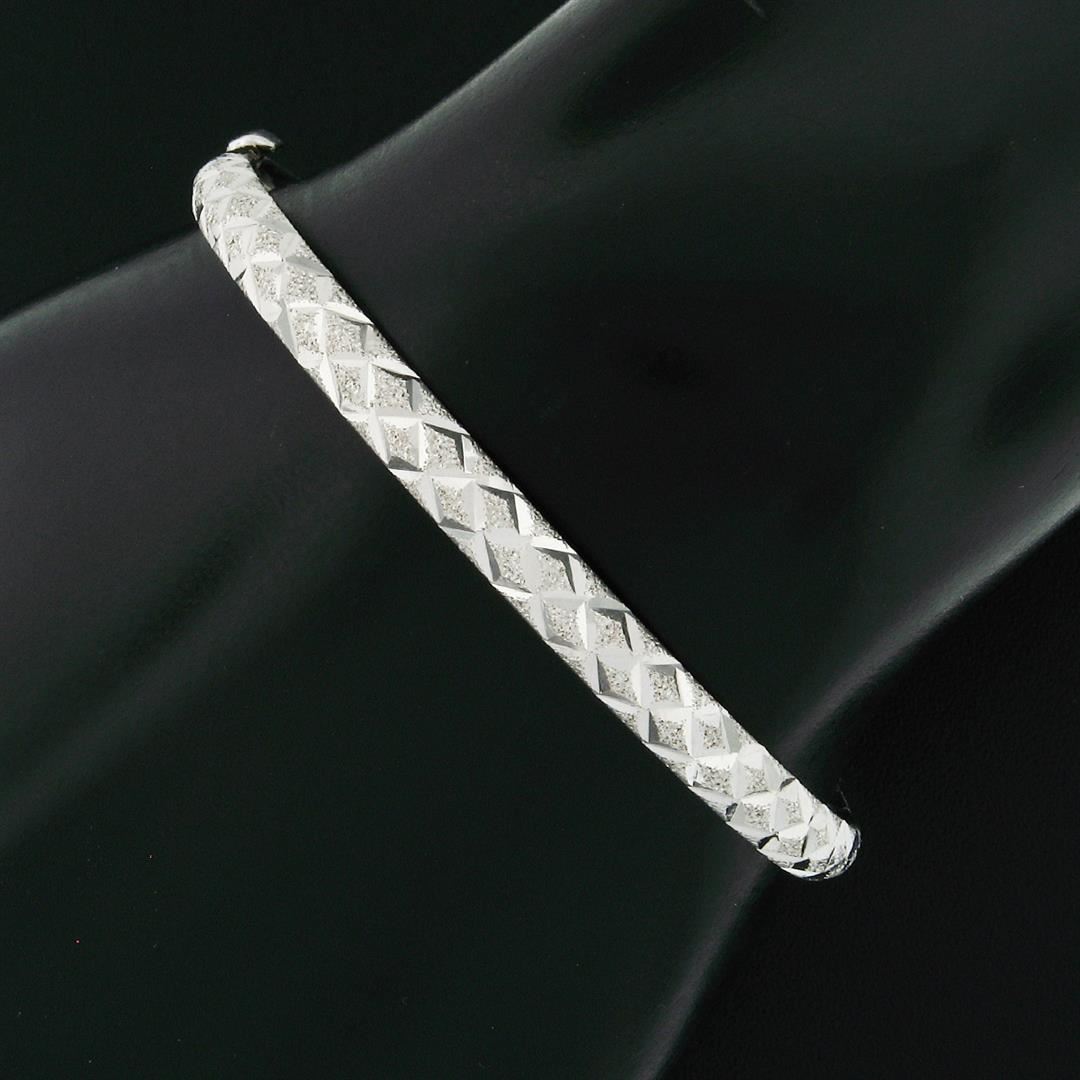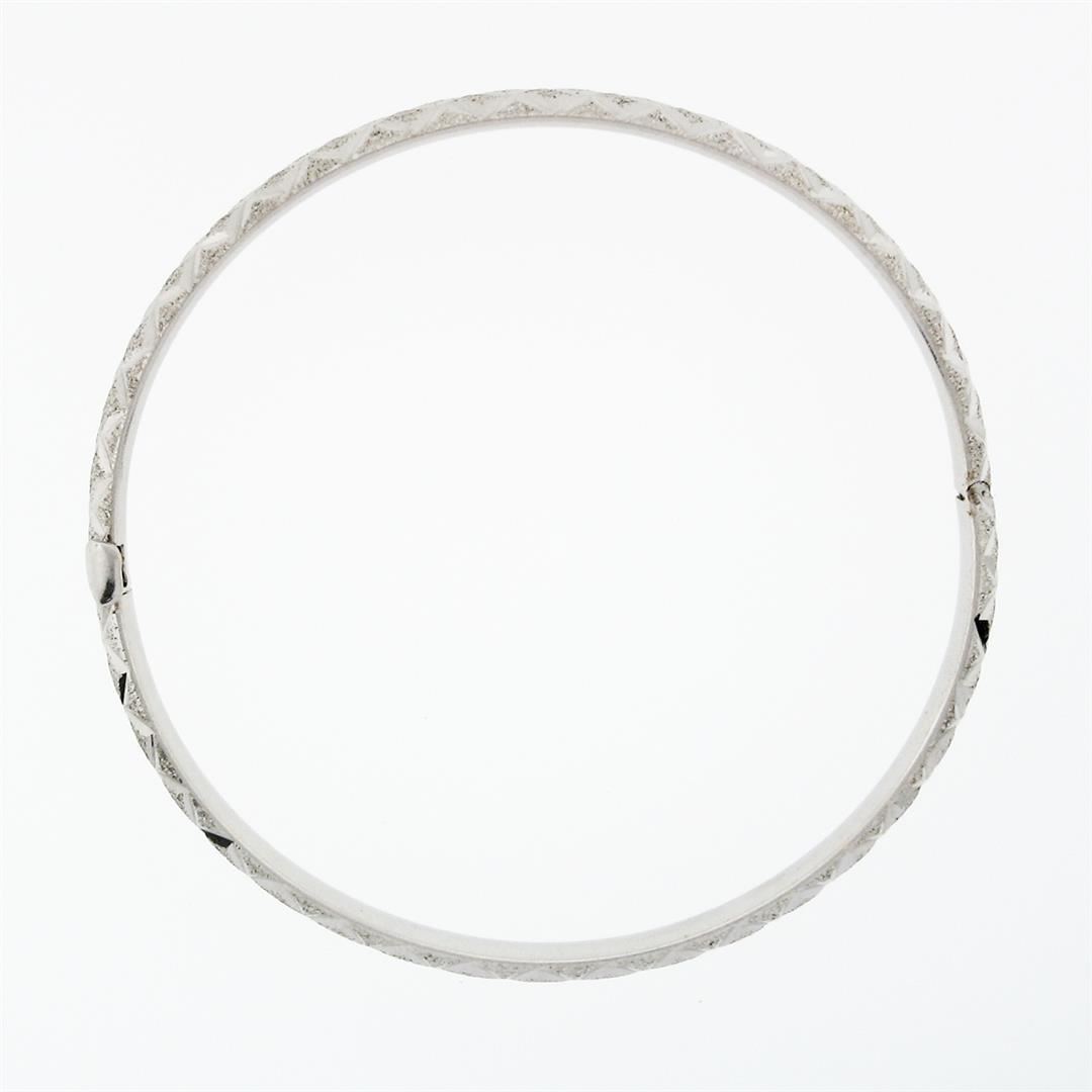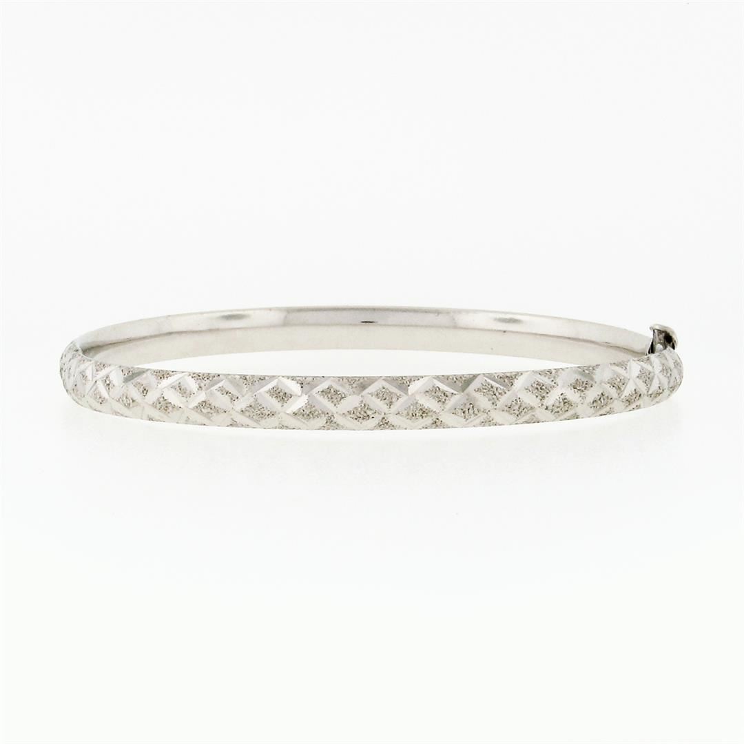 A vintage solid 14k white gold textured slip on bangle bracelet. It weighs a total of 6.86 grams, measures 60.3mm wide, and measures 6.5 inches in length.