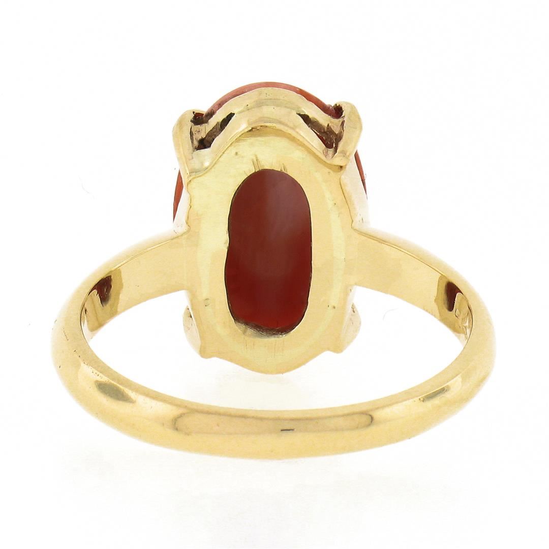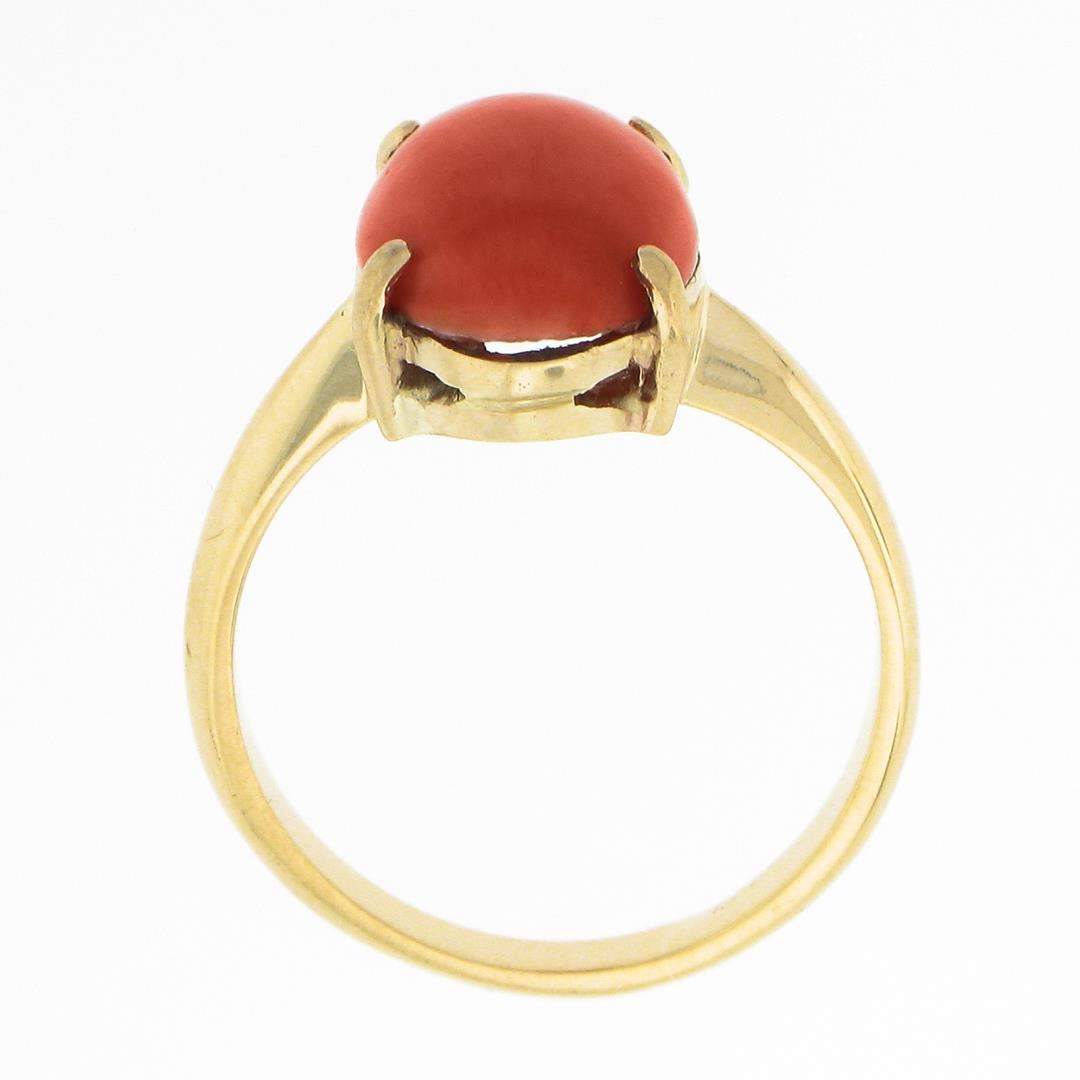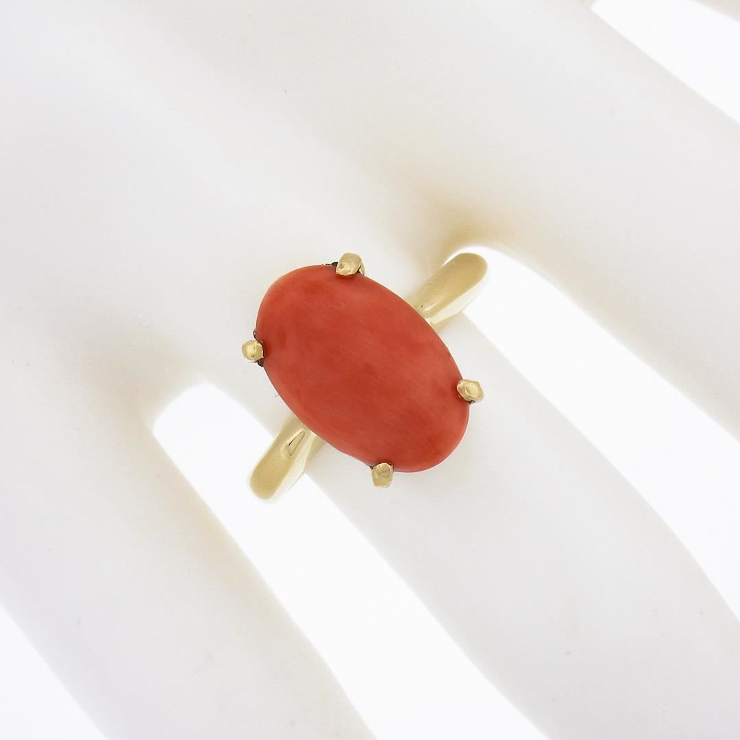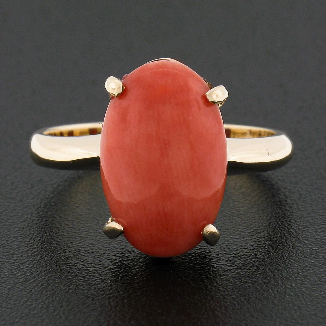 A vintage solid 14k yellow gold solitaire ring, with 1 oval cabochon cut aural coral (14.2x9.3mm). The ring is size 7.0, weighs a total of 4.32 grams, and measures 14.3mm wide.