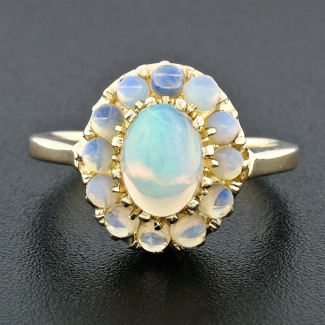 A solid 14k yellow gold cluster ring, with 1 oval cabochon cut natural opal (8.15x6mm), surrounded with a halo of 12 round ball shape natural opals (2.25mm to 2.5mm). The ring is size 7.0, weighs a total of 4.07 grams, and measures 11.9mm wide.
