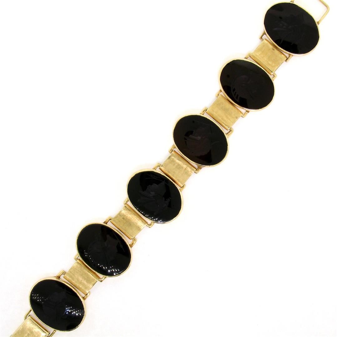Vintage 14K Gold Florentine Large Dark Carnelian Carved Intaglio Knight Bracelet. Please see photos and description for all available information. A vintage solid 14k yellow gold bracelet, featuring 6 oval shape carved natural carnelian (23.75x17.85mm). It weighs a total of 47.11 grams, measures 25.50mm wide, and measures 7.5 inches in length.