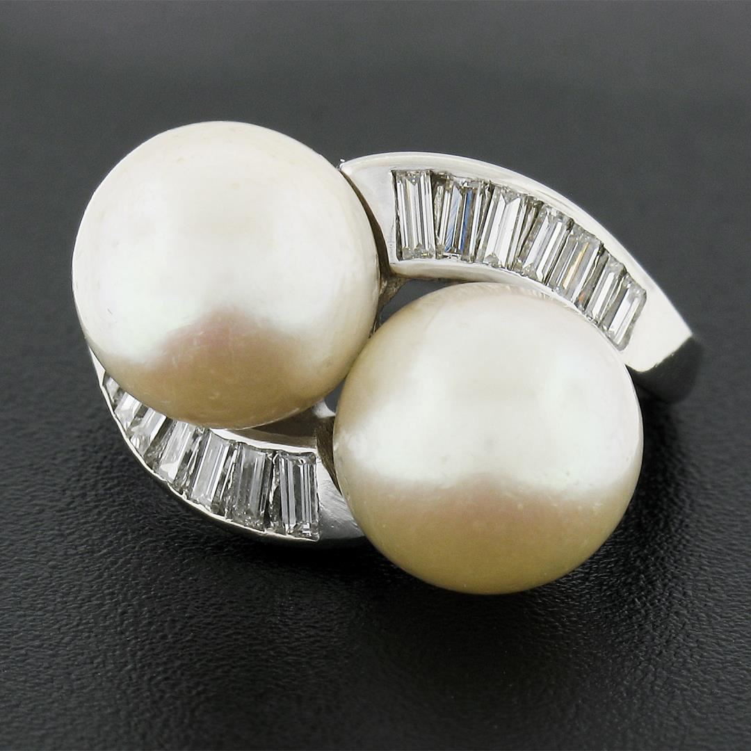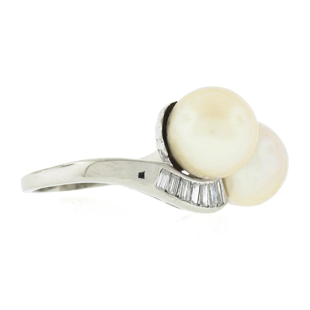 A vintage 14k white gold bypass ring, with 2 GIA graded cultured saltwater akoya pearls (9.90 & 9.82mm), with 14 baguette cut natural diamonds (G/H - VS1/VS2 ; 0.40ctw). The ring is size 6.5, weighs a total of 7.25 grams, and measures 13.2mm wide. Comes with all original relevant certifications.