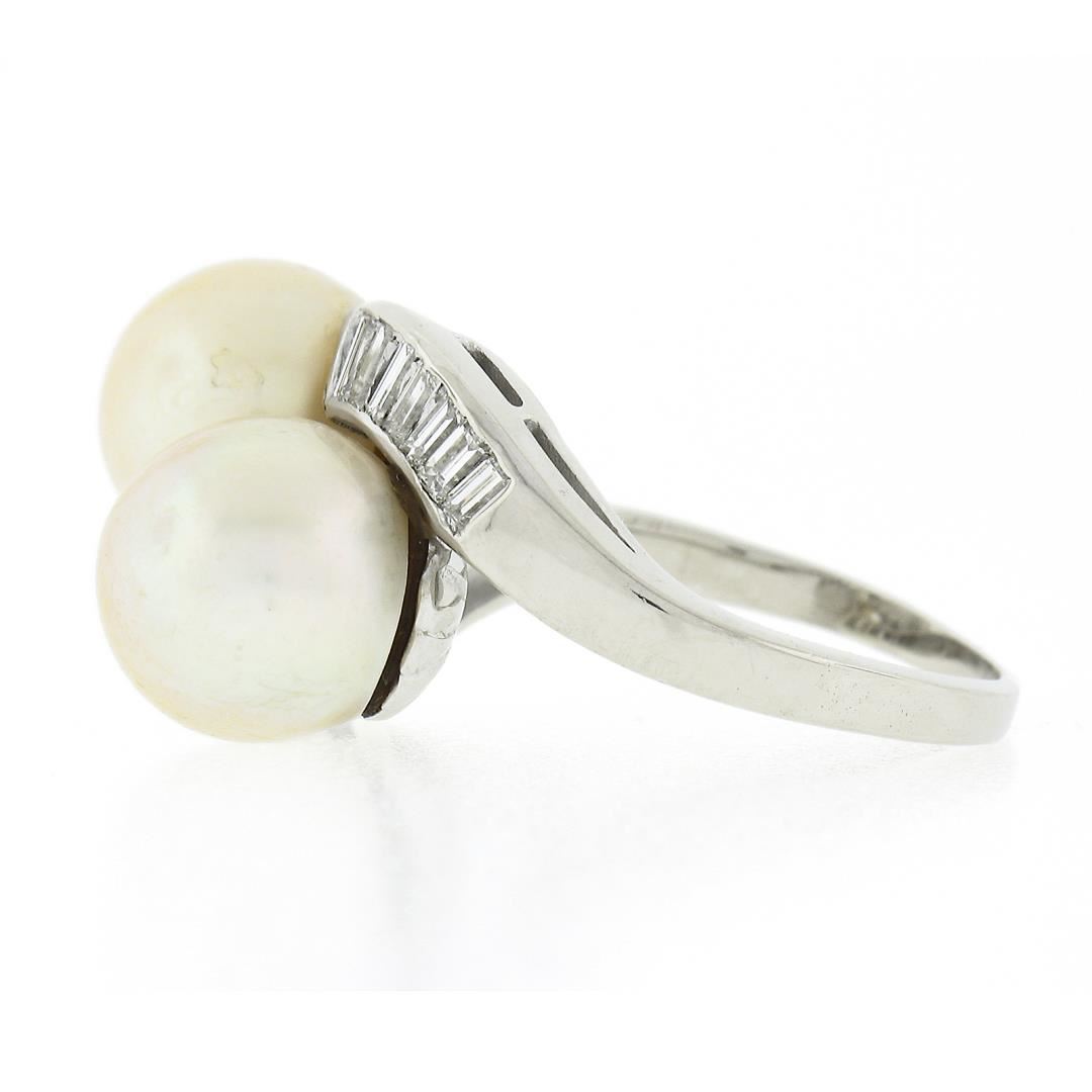 A vintage 14k white gold bypass ring, with 2 GIA graded cultured saltwater akoya pearls (9.90 & 9.82mm), with 14 baguette cut natural diamonds (G/H - VS1/VS2 ; 0.40ctw). The ring is size 6.5, weighs a total of 7.25 grams, and measures 13.2mm wide. Comes with all original relevant certifications.