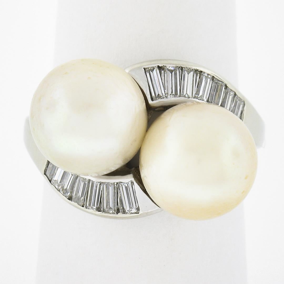 A vintage 14k white gold bypass ring, with 2 GIA graded cultured saltwater akoya pearls (9.90 & 9.82mm), with 14 baguette cut natural diamonds (G/H - VS1/VS2 ; 0.40ctw). The ring is size 6.5, weighs a total of 7.25 grams, and measures 13.2mm wide. Comes with all original relevant certifications.