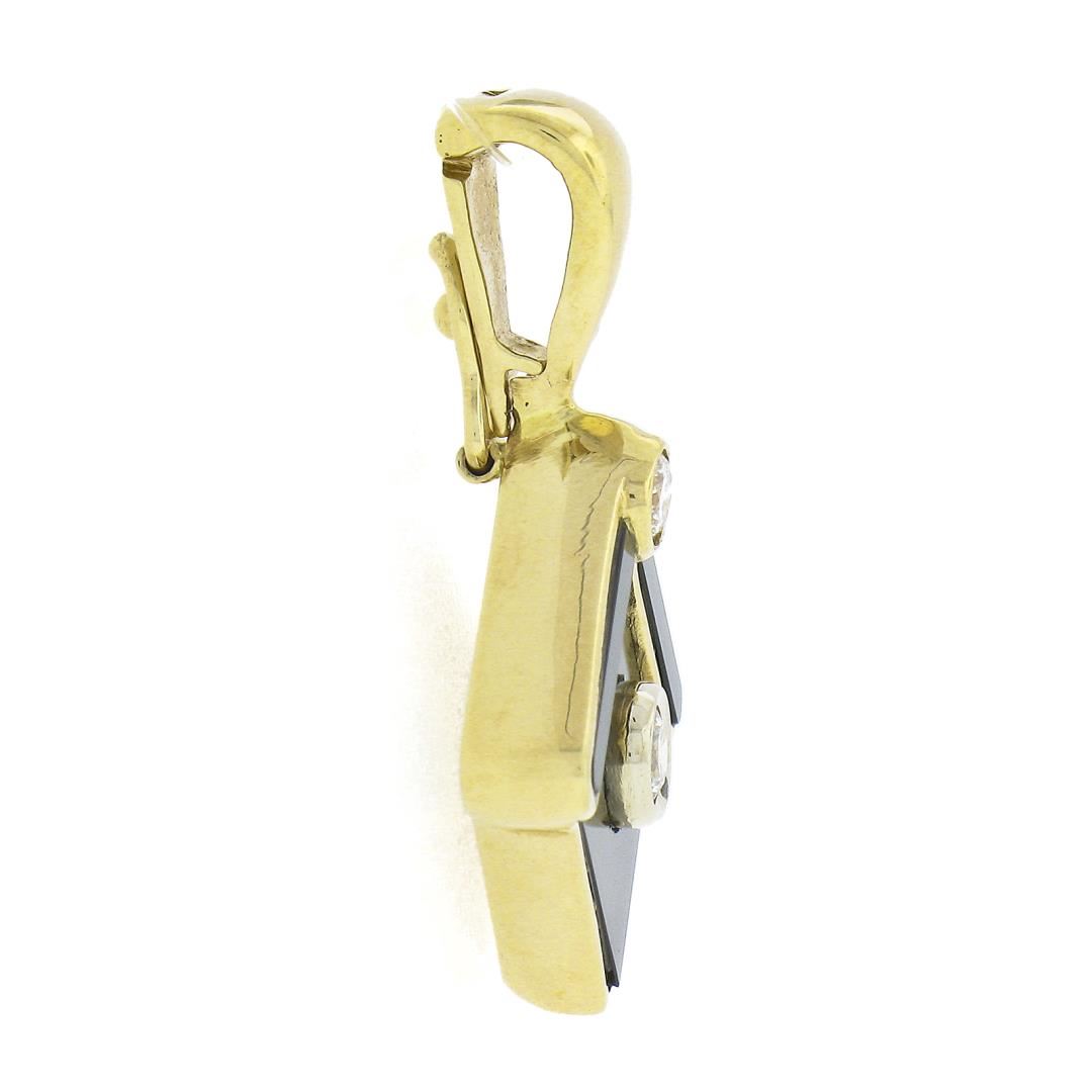 A vintage solid 14k yellow gold enhancer pendant, with 3 square & custom cut black onyx ((1) 14.2x14.2mm- (2) 10.6x1.7mm) . and 2 round cut natural diamonds (G/H - VS2 ; 0.28ctw ). The pendant weighs a total of 6.62 grams, measures 30.8x19.9mm including the bail, and the inside of the bail measures 7.1x3.2mm.