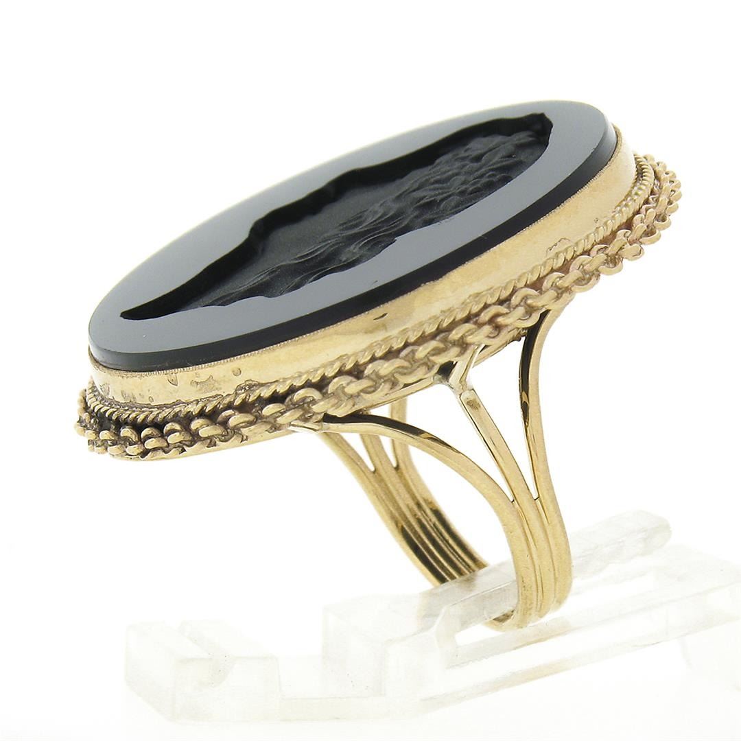 A solid 14k yellow gold platter ring, with 1 round carved intaglio natural black onyx (29.60mm). The ring is size 6.5, weighs a total of 10.83 grams, and measures 34.30mm in diameter.