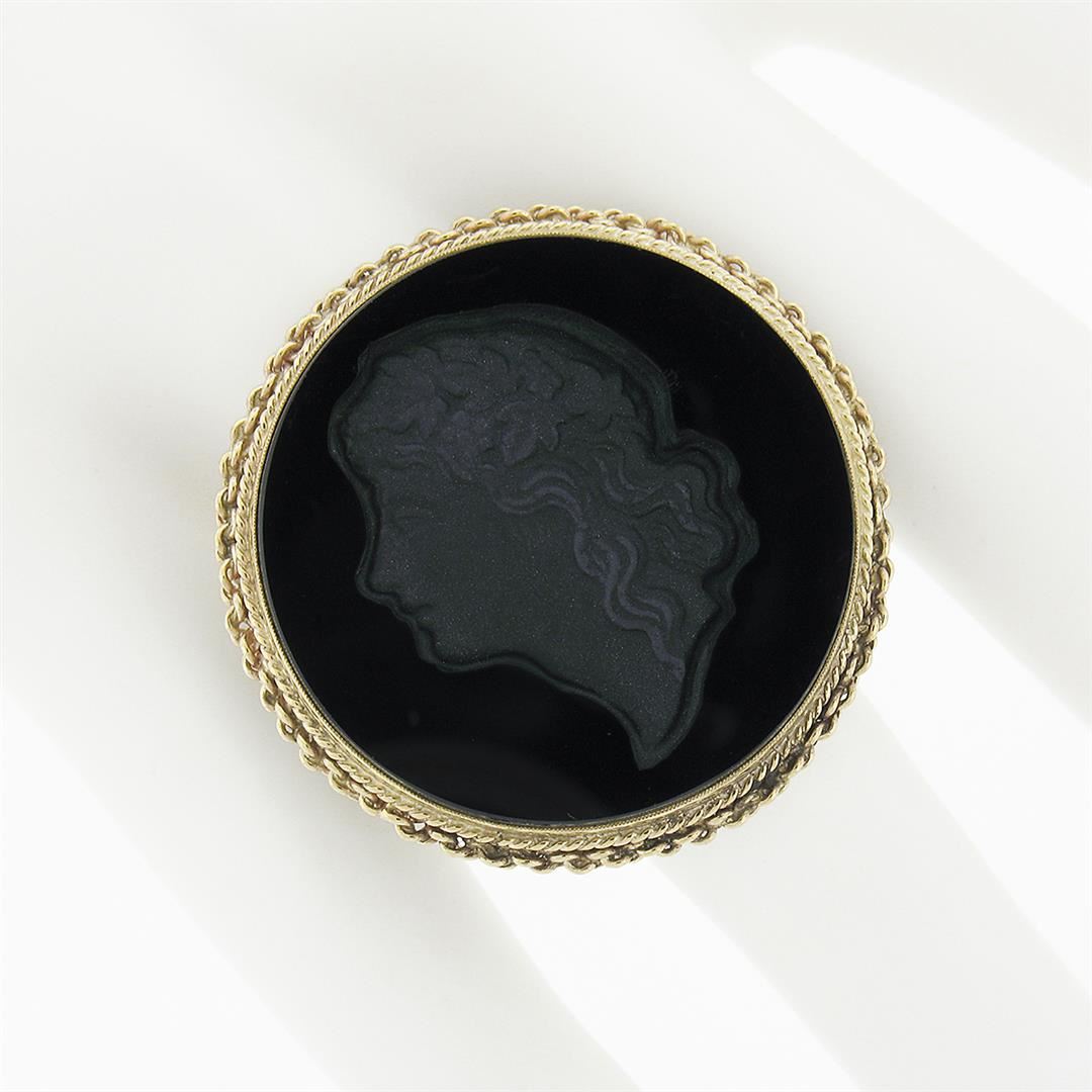 A solid 14k yellow gold platter ring, with 1 round carved intaglio natural black onyx (29.60mm). The ring is size 6.5, weighs a total of 10.83 grams, and measures 34.30mm in diameter.