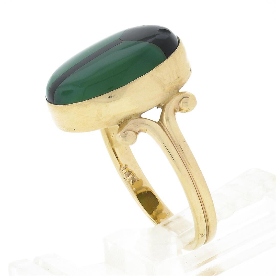 A solid 14k yellow gold scarav beetle ring, with inlaid set 2 natural chrysoprase and 2 natural black onyx. The ring is size 7.5, weighs a total of 4.12 grams, and measures 15.60mm wide.