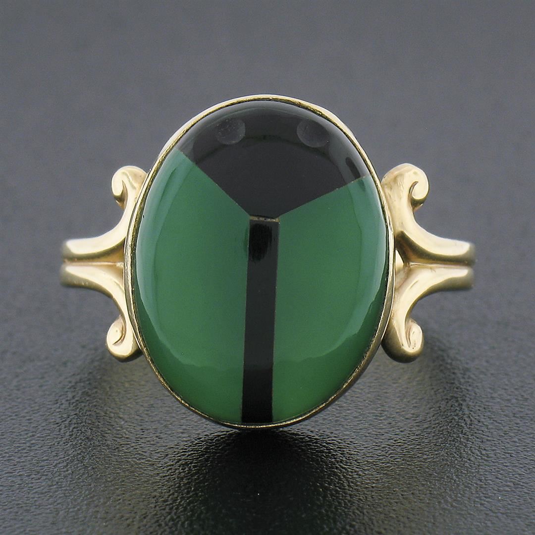 A solid 14k yellow gold scarav beetle ring, with inlaid set 2 natural chrysoprase and 2 natural black onyx. The ring is size 7.5, weighs a total of 4.12 grams, and measures 15.60mm wide.