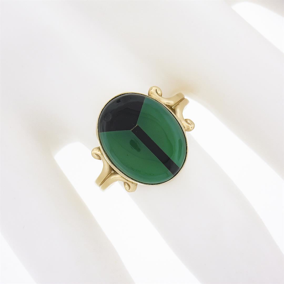 A solid 14k yellow gold scarav beetle ring, with inlaid set 2 natural chrysoprase and 2 natural black onyx. The ring is size 7.5, weighs a total of 4.12 grams, and measures 15.60mm wide.
