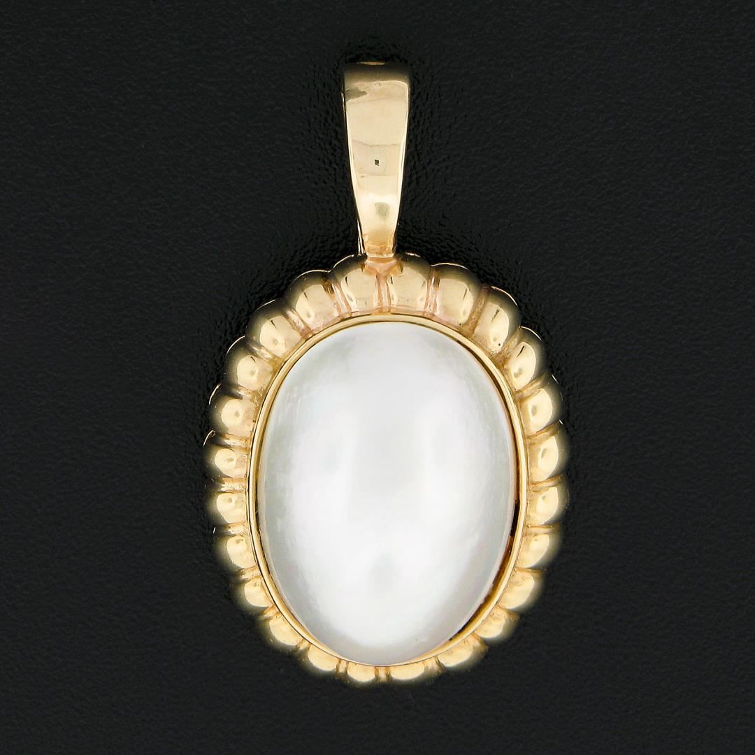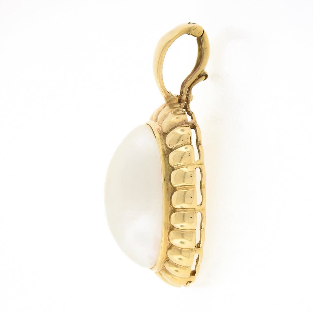 A vintage solid 14k yellow gold enhancer pendant, with oval shape cultured Mabe pearl (18x13.1mm). The pendant weighs a total of 5.07 grams, measures 32.8x19.2mm including the bail, and the inside of the bail measures 6.7x4.5mm.