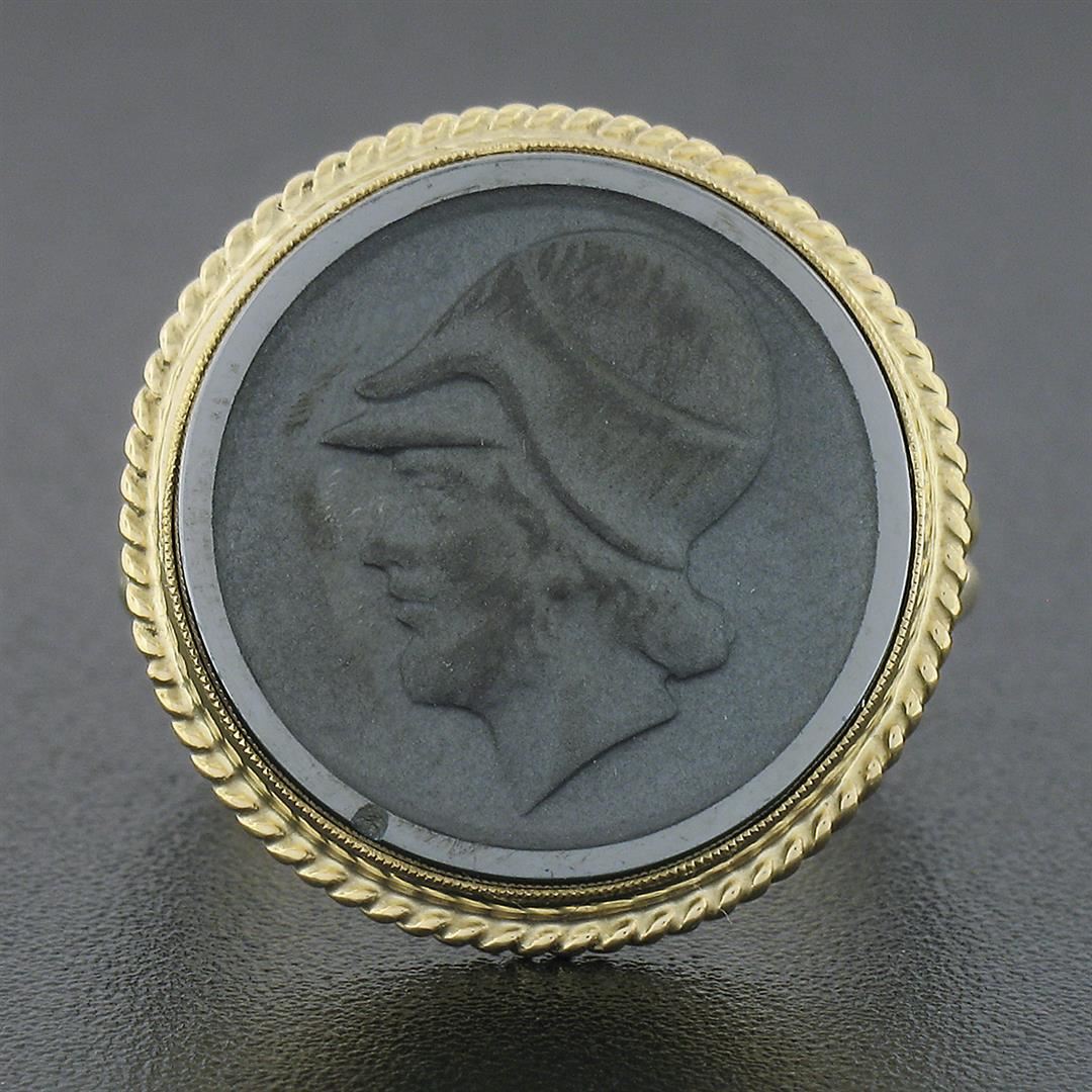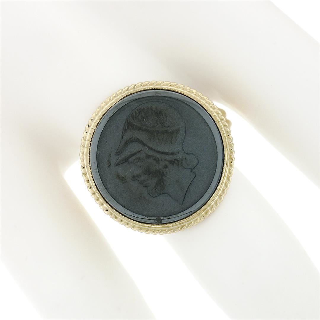 A vintage solid 14k yellow gold intaglio ring, with 1 round shape natural hematite (17.4mm). The ring is size 9.0, weighs a total of 5.94 grams, and measures 20.4mm wide.
