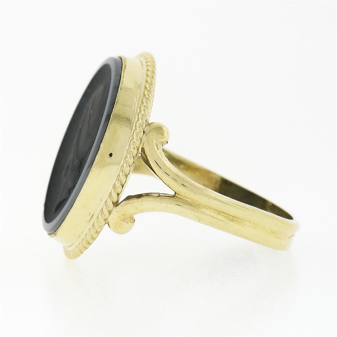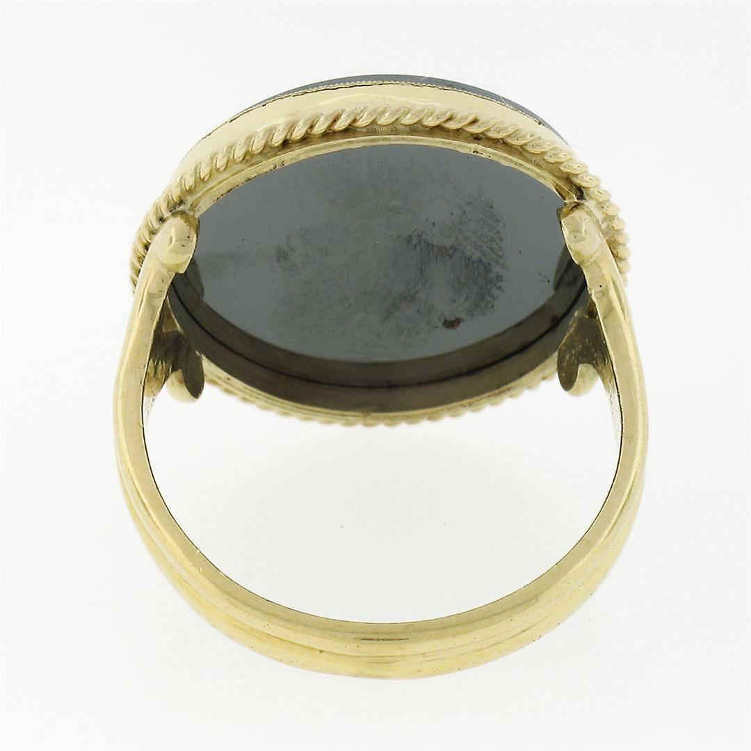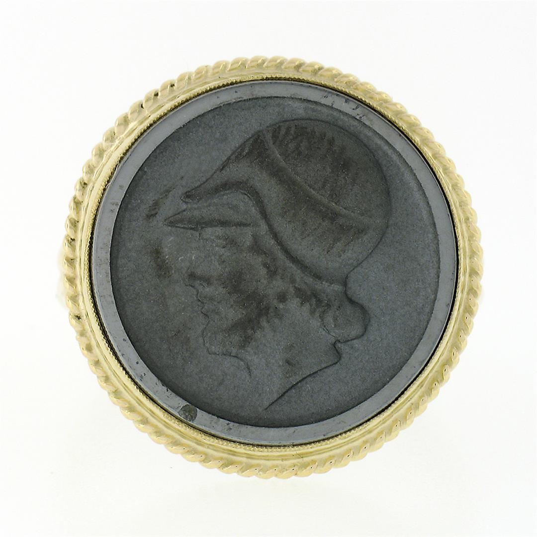 A vintage solid 14k yellow gold intaglio ring, with 1 round shape natural hematite (17.4mm). The ring is size 9.0, weighs a total of 5.94 grams, and measures 20.4mm wide.