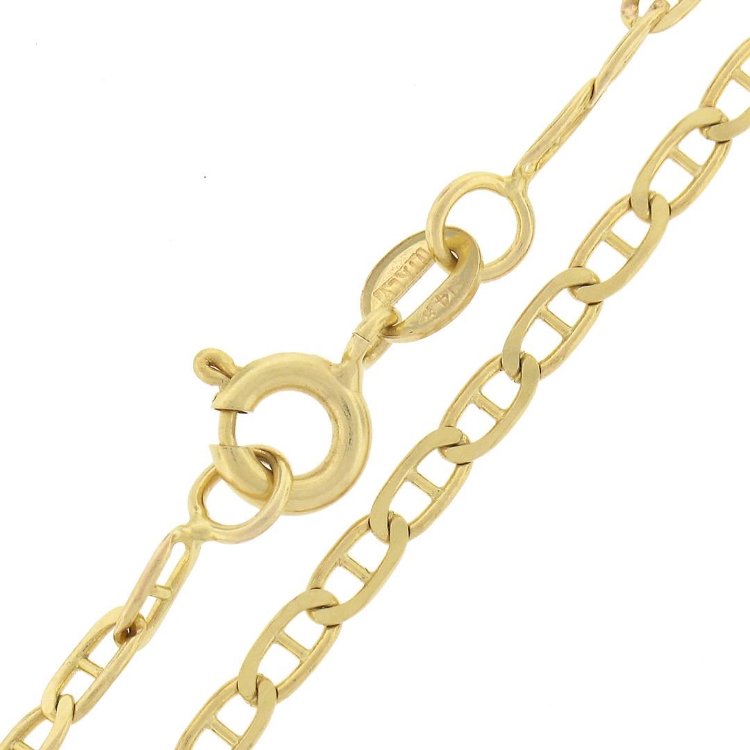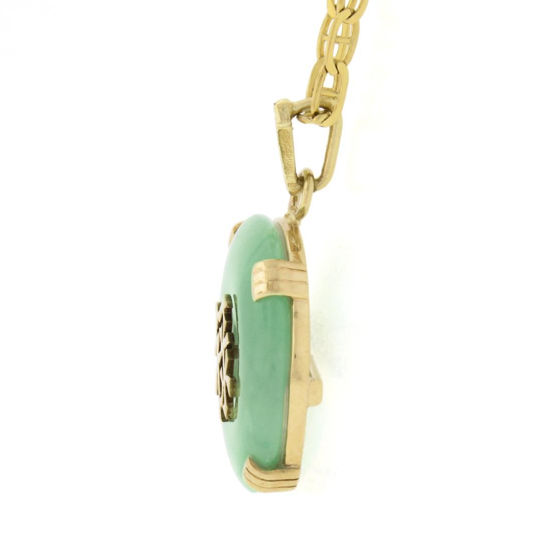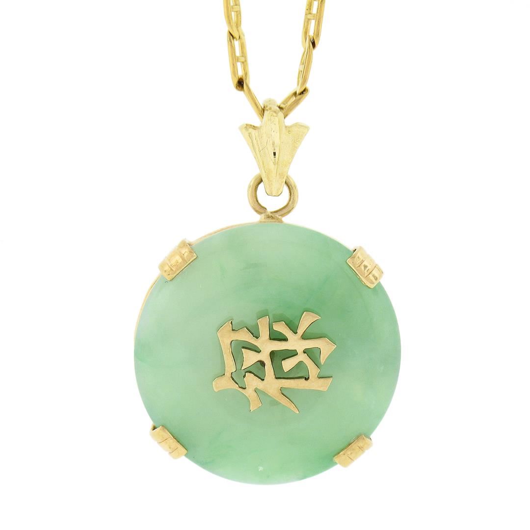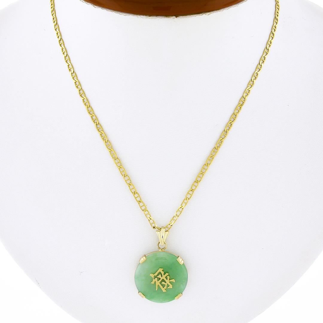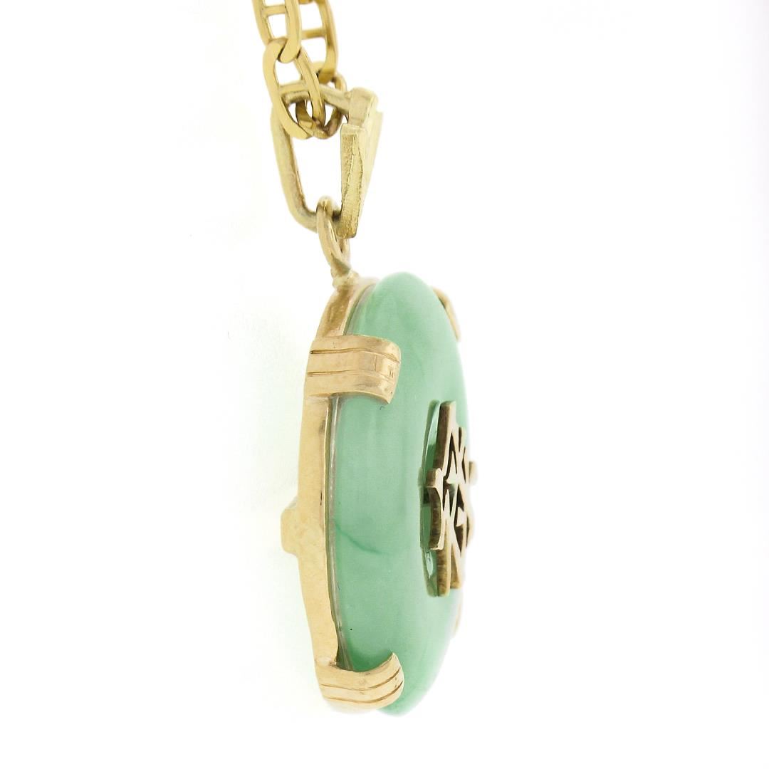 A vintage solid 14k yellow gold pendant necklace, with 1 round pierced cabochon cut natural jade (20.2mm). 17.5 inch mariner link chain, 10.12 grams total weight, pendant measures 28.4x20.2mm.