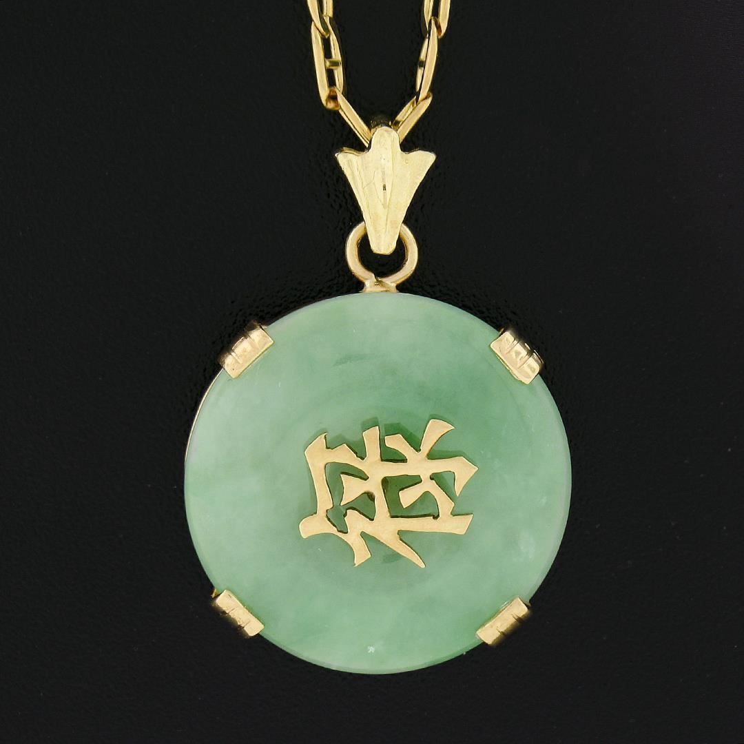 A vintage solid 14k yellow gold pendant necklace, with 1 round pierced cabochon cut natural jade (20.2mm). 17.5 inch mariner link chain, 10.12 grams total weight, pendant measures 28.4x20.2mm.