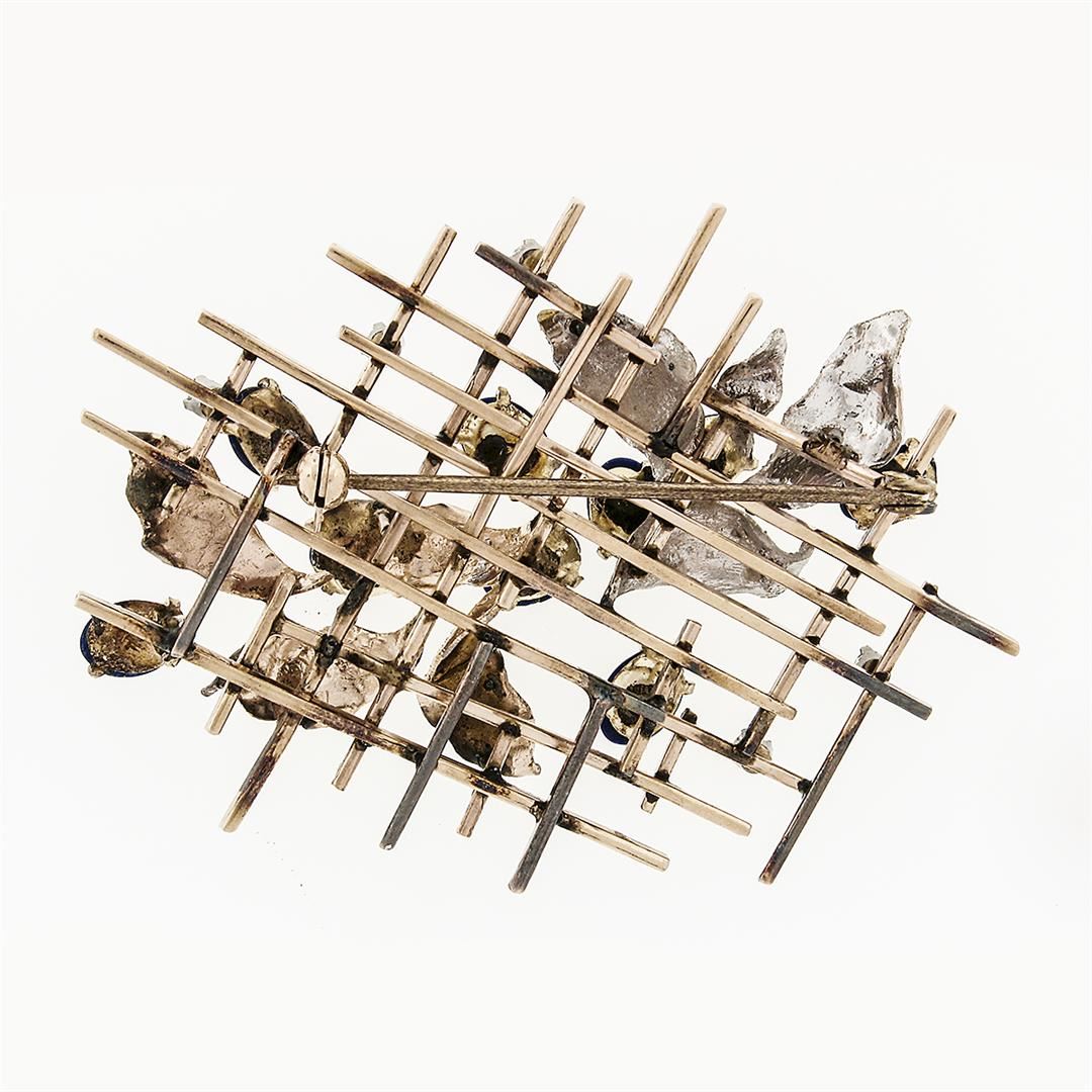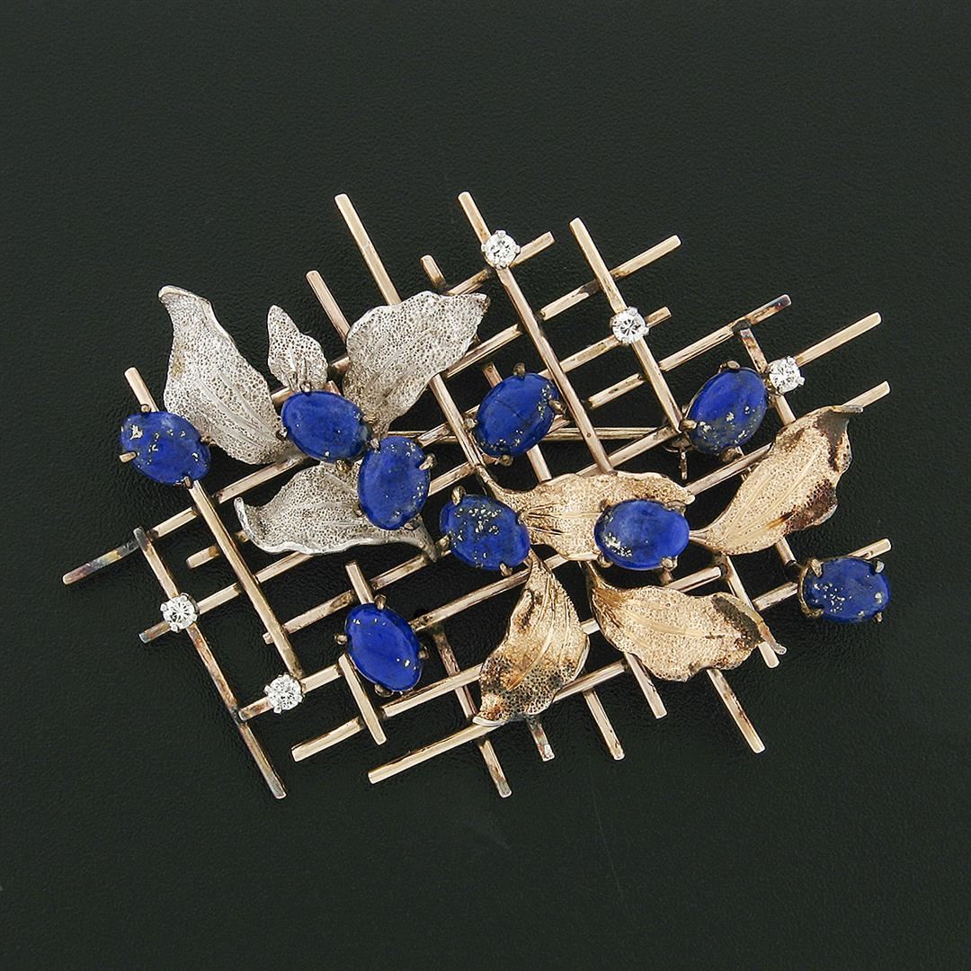 A vintage solid 14k yellow, rose & white gold grid leaf pin brooch, with 9 oval cabochon cut natural lapis (7.0x5.0mm), and 5 round brilliant cut natural diamonds (VS2 ; G - 0.20ctw). Measures 45x61.5mm and weighs a total of 20.09 grams.