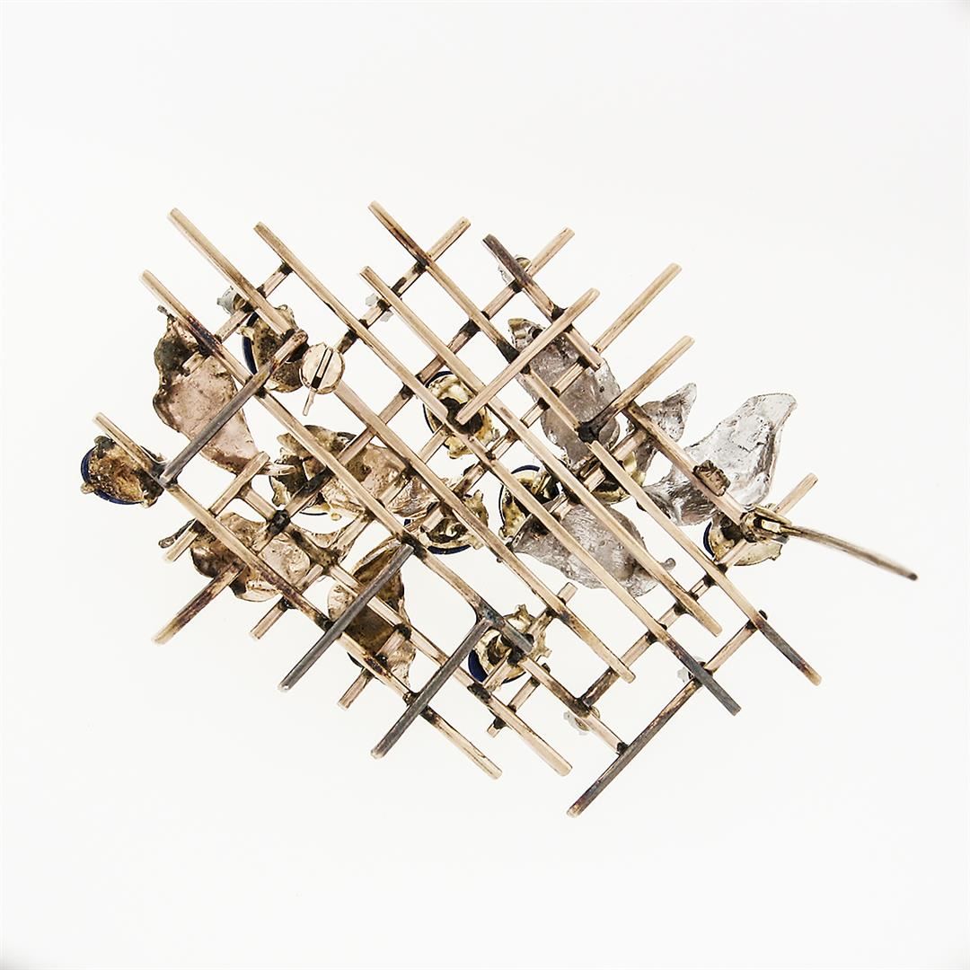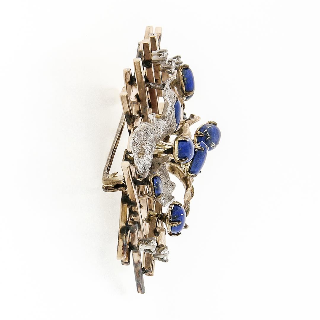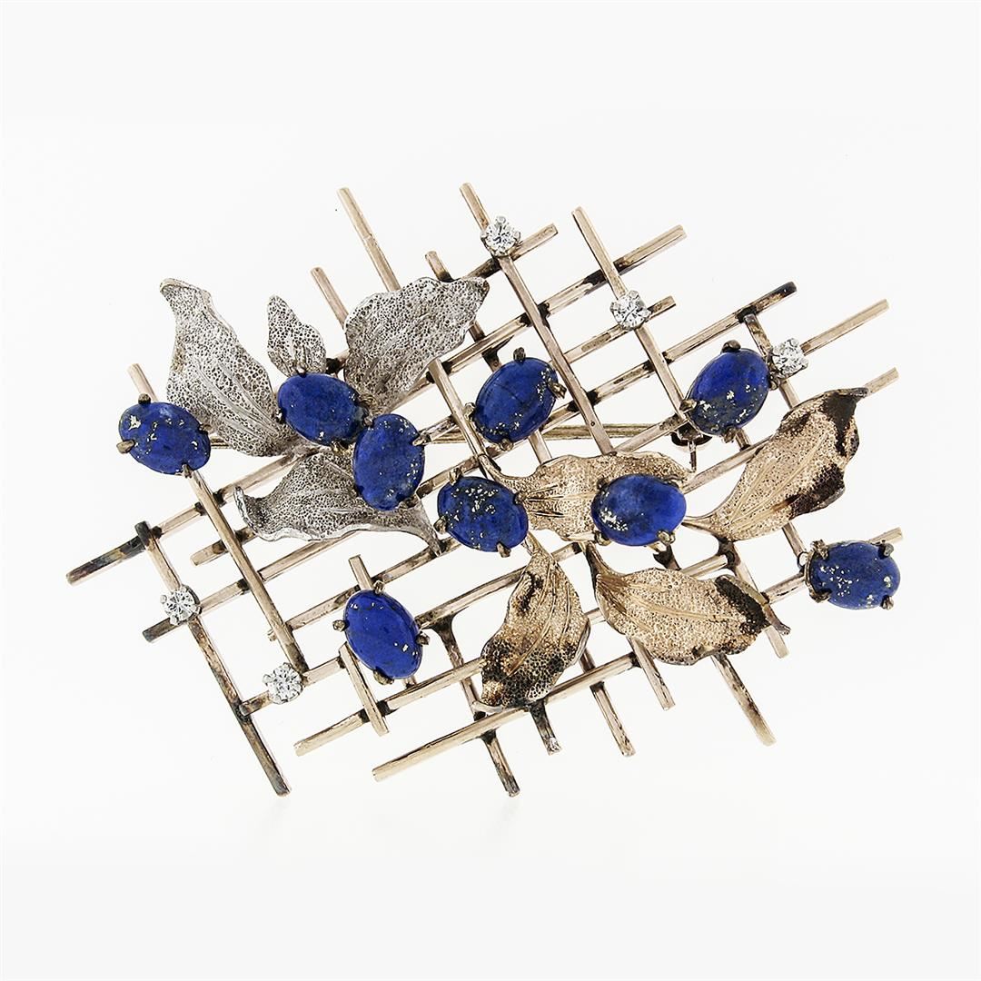 A vintage solid 14k yellow, rose & white gold grid leaf pin brooch, with 9 oval cabochon cut natural lapis (7.0x5.0mm), and 5 round brilliant cut natural diamonds (VS2 ; G - 0.20ctw). Measures 45x61.5mm and weighs a total of 20.09 grams.