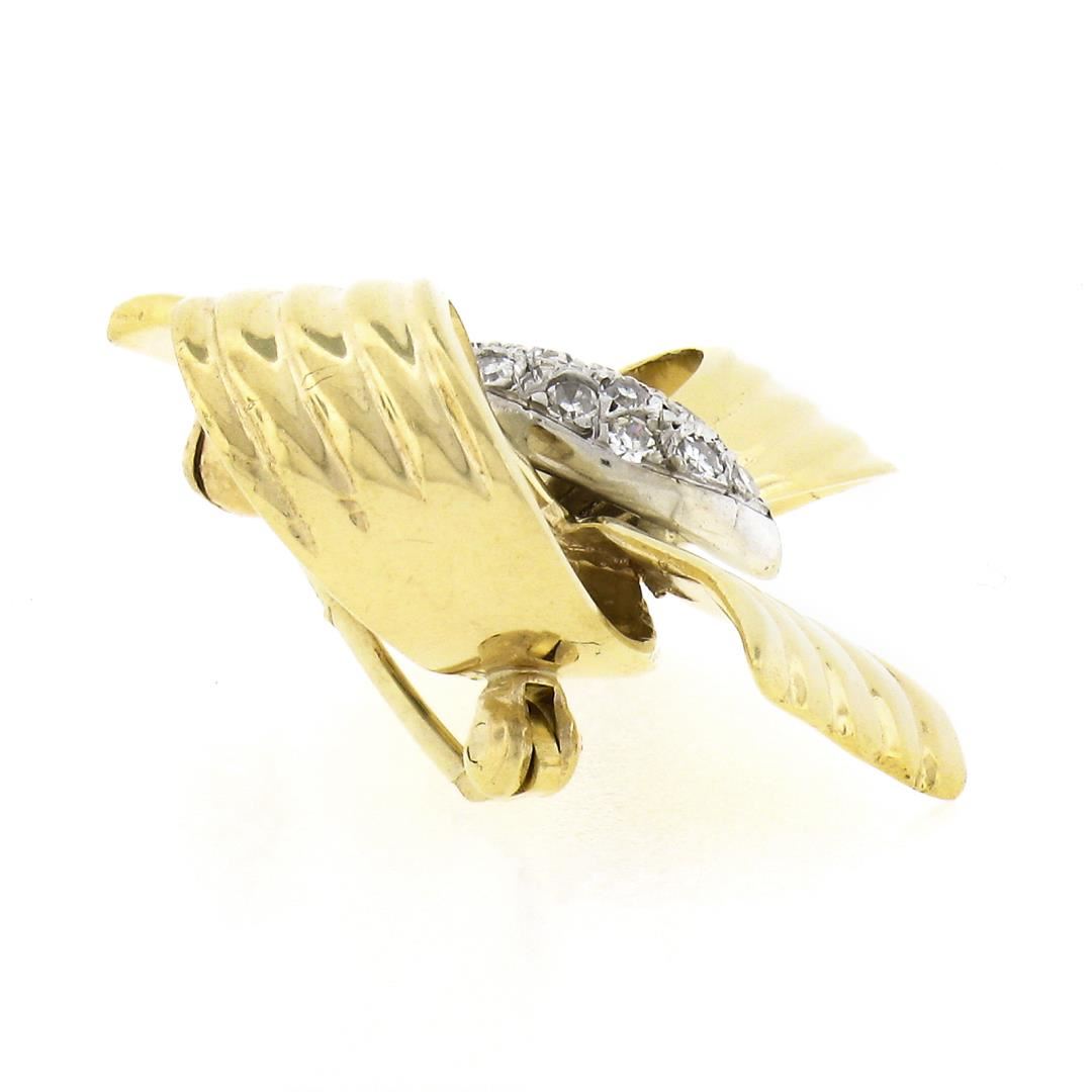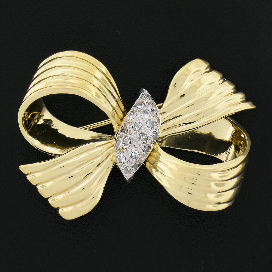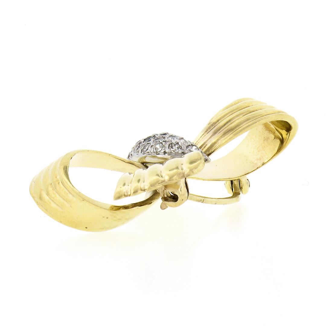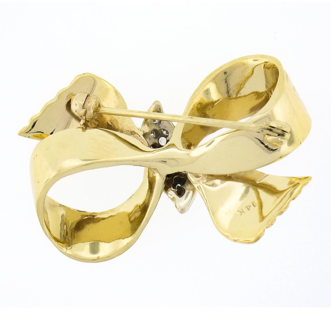 A vintage solid 14k two tone gold bow brooch, with 18 single cut natural diamonds (G/H - VS2/SI1 ; 0.20ctw). Measures 24.20x34.40mm and weighs a total of 8.25 grams.